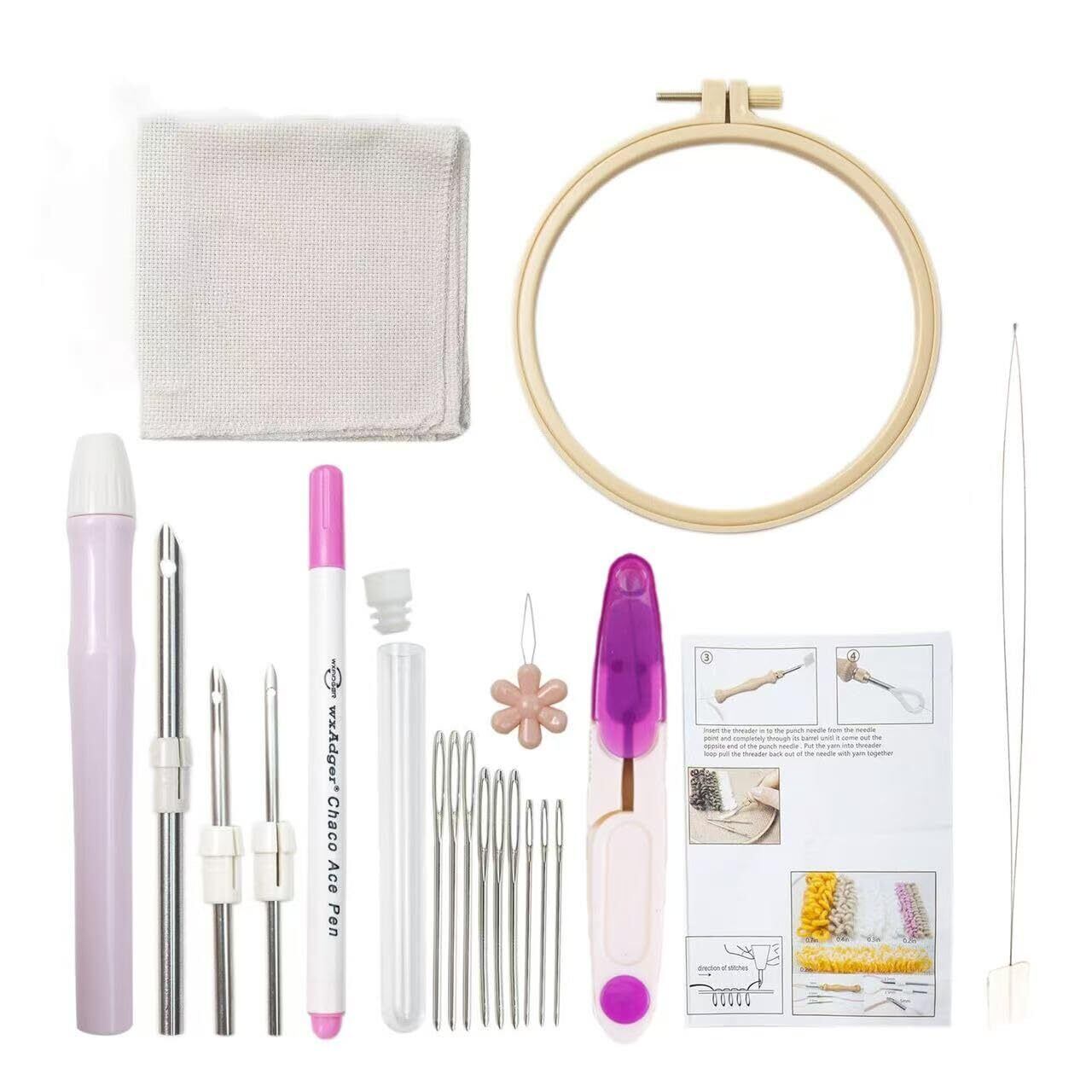 セット内容:刺繍ペン、刺繍枠、9本の刺繍針、布、針通し器、マーカーペン、説明書が含まれた完全な初心者向けキット