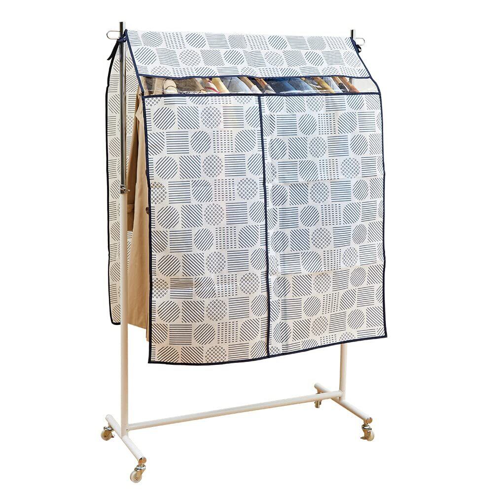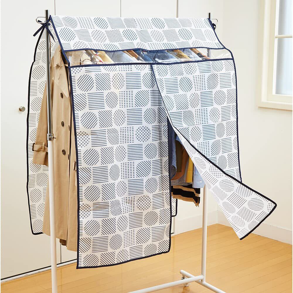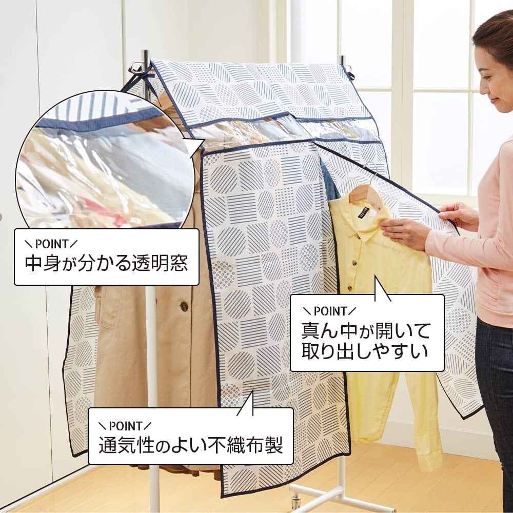 ホコリを防ぎ、おしゃれに収納。コートなどもすっぽりカバーします。通気性のよい不織布製で、中身が分かる透明窓付き。真ん中が開いくから衣類が取り出しやすい! 固定用のヒモが付いているのでずれ落ちにくく安心です。
