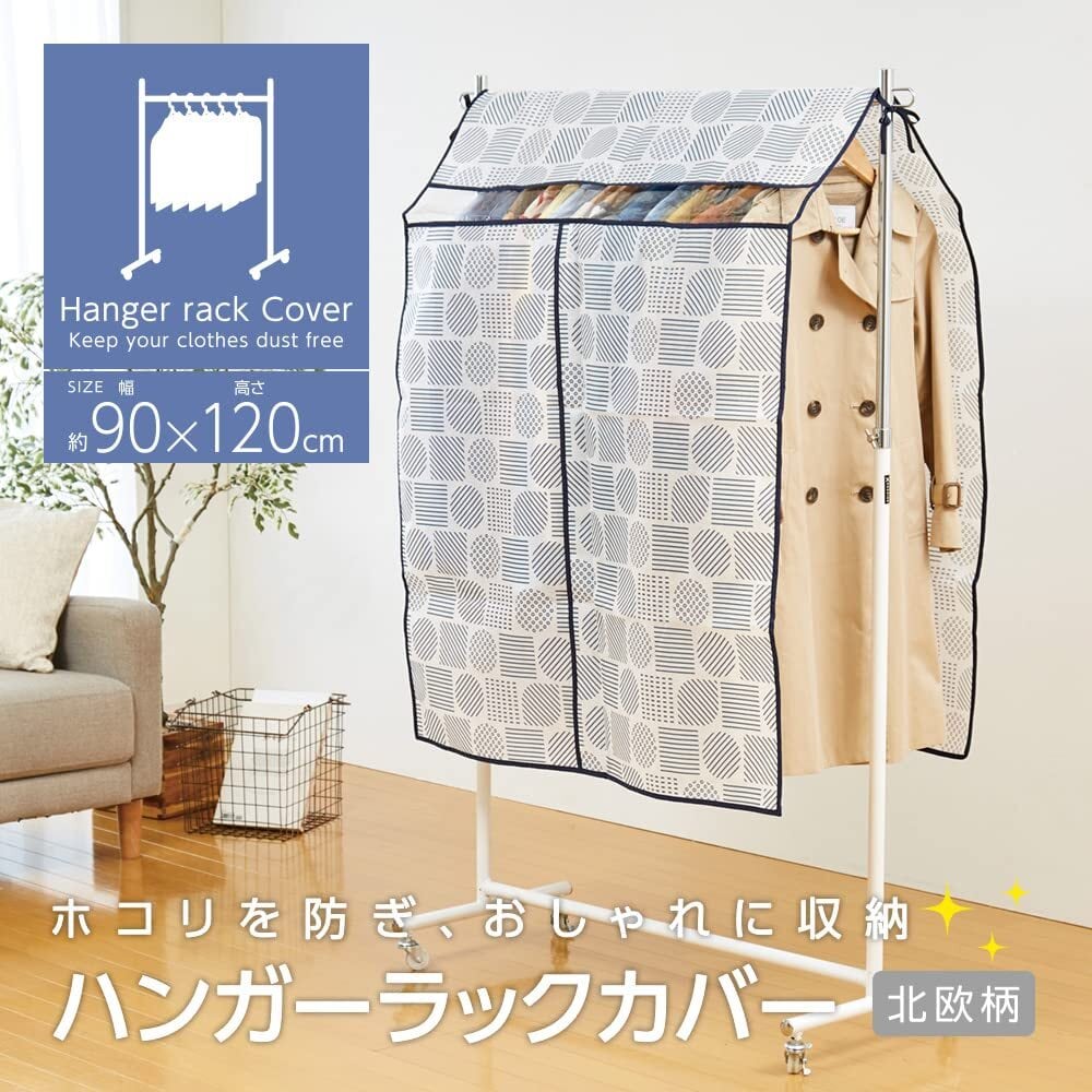 アイメディア(Aimedia) ハンガーラックカバー 洋服カバー 衣類カバー 幅90cm 衣類収納 北欧柄 不織布 防塵 透明窓付き 固定紐
