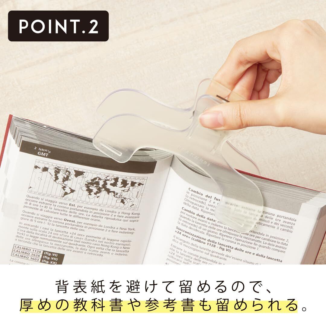 ①2か所で真ん中を隠さず留めるので、書籍の内容が見やすい。 ②背表紙を避けて留めるので、厚めの教科書や参考書も留められる。 ③書籍の中央部分を挟まないので、ページの開き癖がつきにくい。 ④軽い力でガバっと大きく開く。 ノートに、地図に、手帳に、レシピに…etc