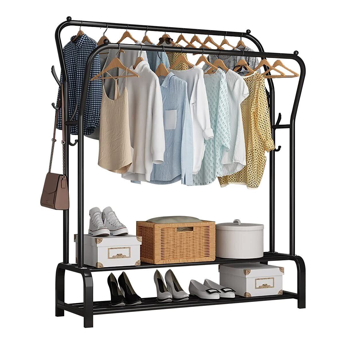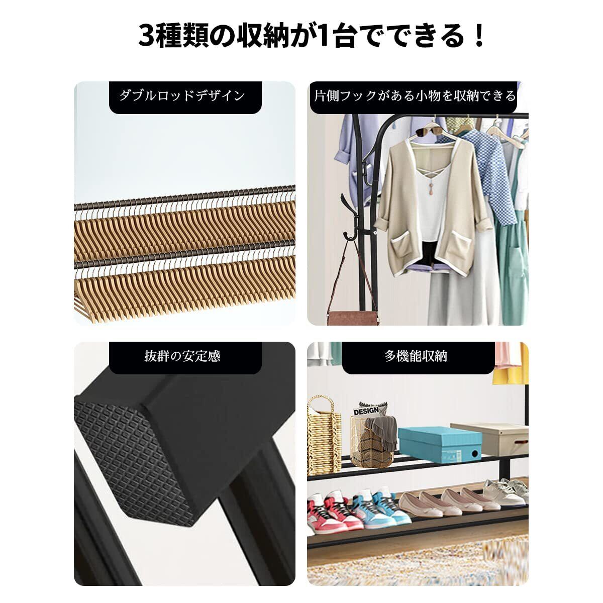 【収納性抜群】ベッドルームの整理に使えるときは、コード、帽子、スカーフ、ネクタイなどを簡単に掛けることできます。ラック部分は靴、収納ケース、布団などを収納できます。上にコート、洋服、帽子やバッグなどを掛けることができる。また下に2段棚がついており、バッグや収納ボックス、靴、カバン、タオル、薄い布団や小物などもスッキリ収納できます!気楽に服の収納以外に、部屋干しのアイテムとして梅雨時期の物干しとして活躍します。
