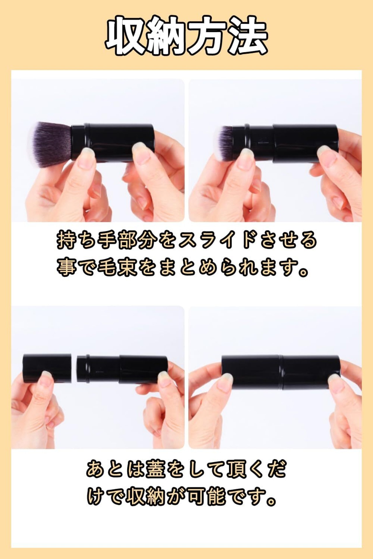 【使用便利】スライド式収納タイプのメイクブラシ、毛先を収納できるタイプです、携帯に便利なメイクブラシです。