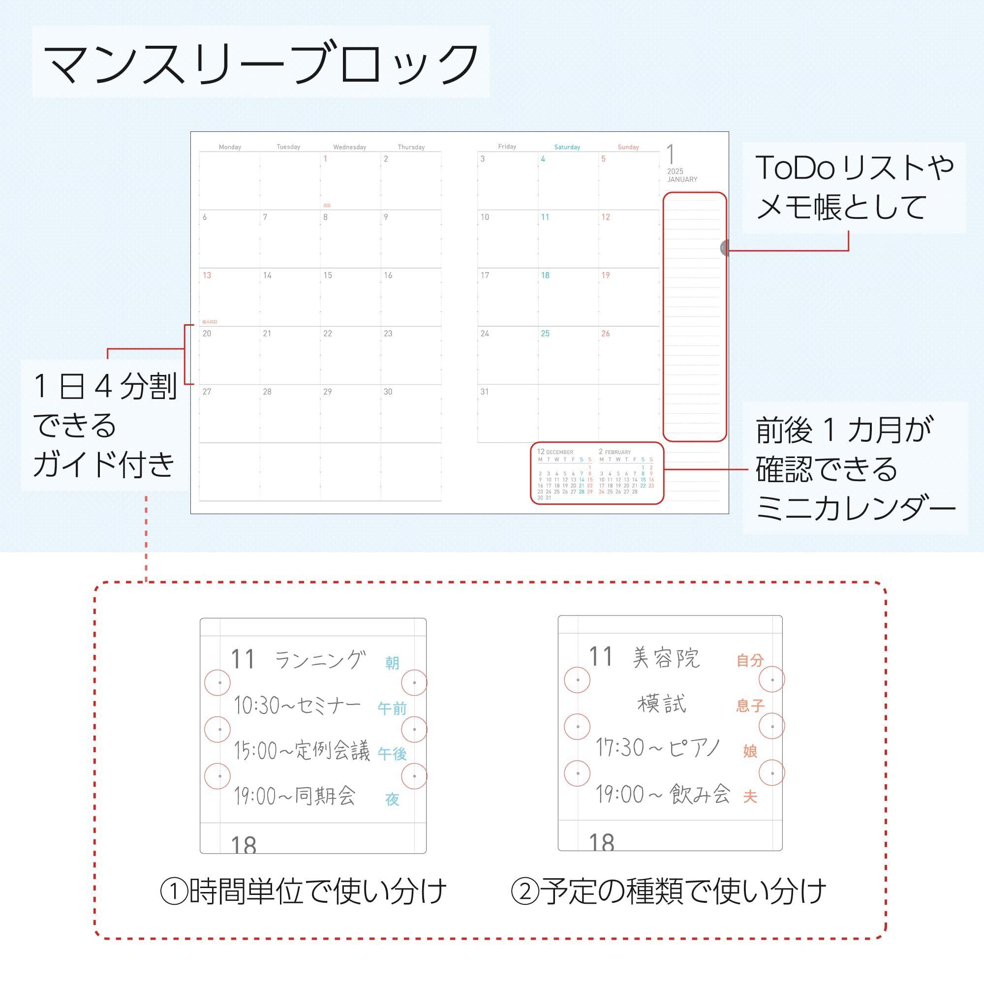 【編集内容】 インデックス・年間カレンダー・イヤープランナー・月間カレンダー(見開き1カ月・ブロック式)・方眼罫ノートページ60枚(121ページ)
