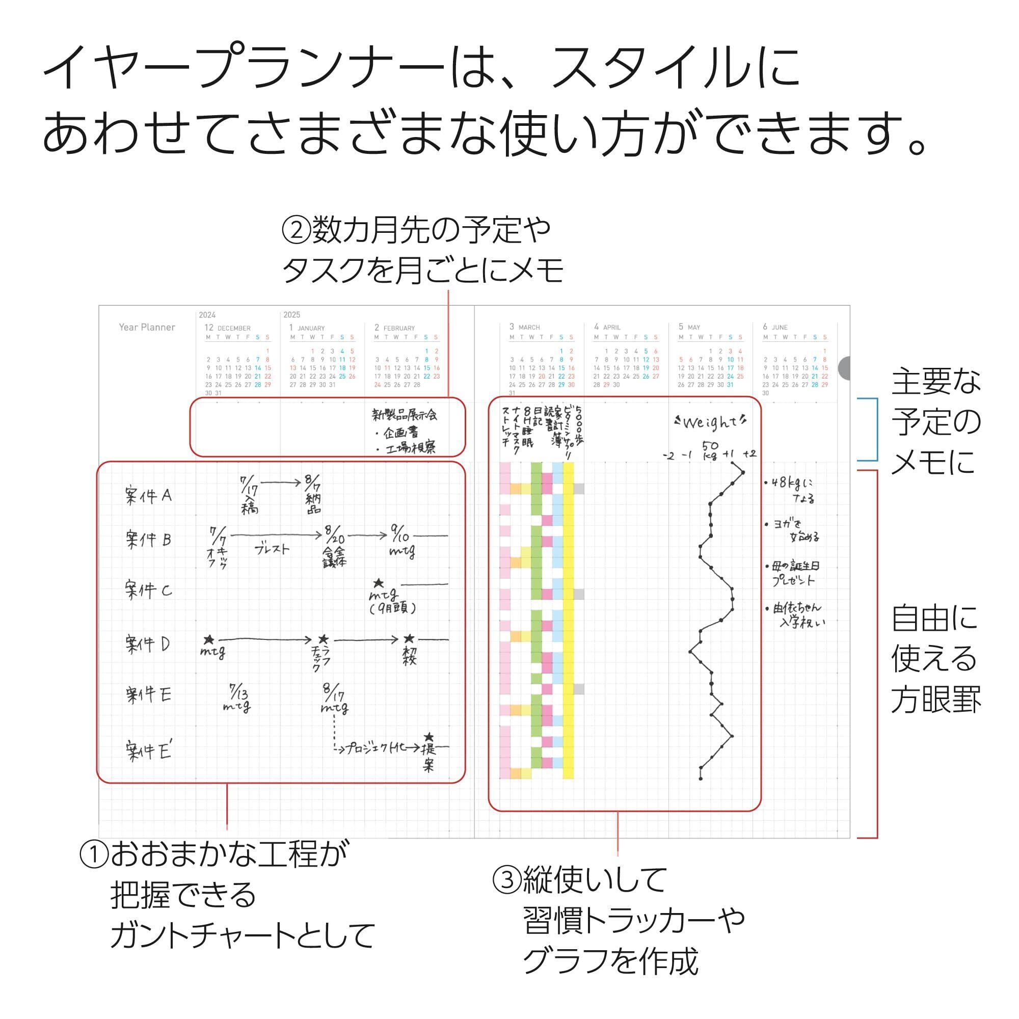 ・見開きで7カ月(約半年)を俯瞰することができるイヤープランナーページを採用。ざっくりとしたガントチャートやフューチャーログ的な使い方ができ、業務の流れや計画を長期単位で管理することができます。