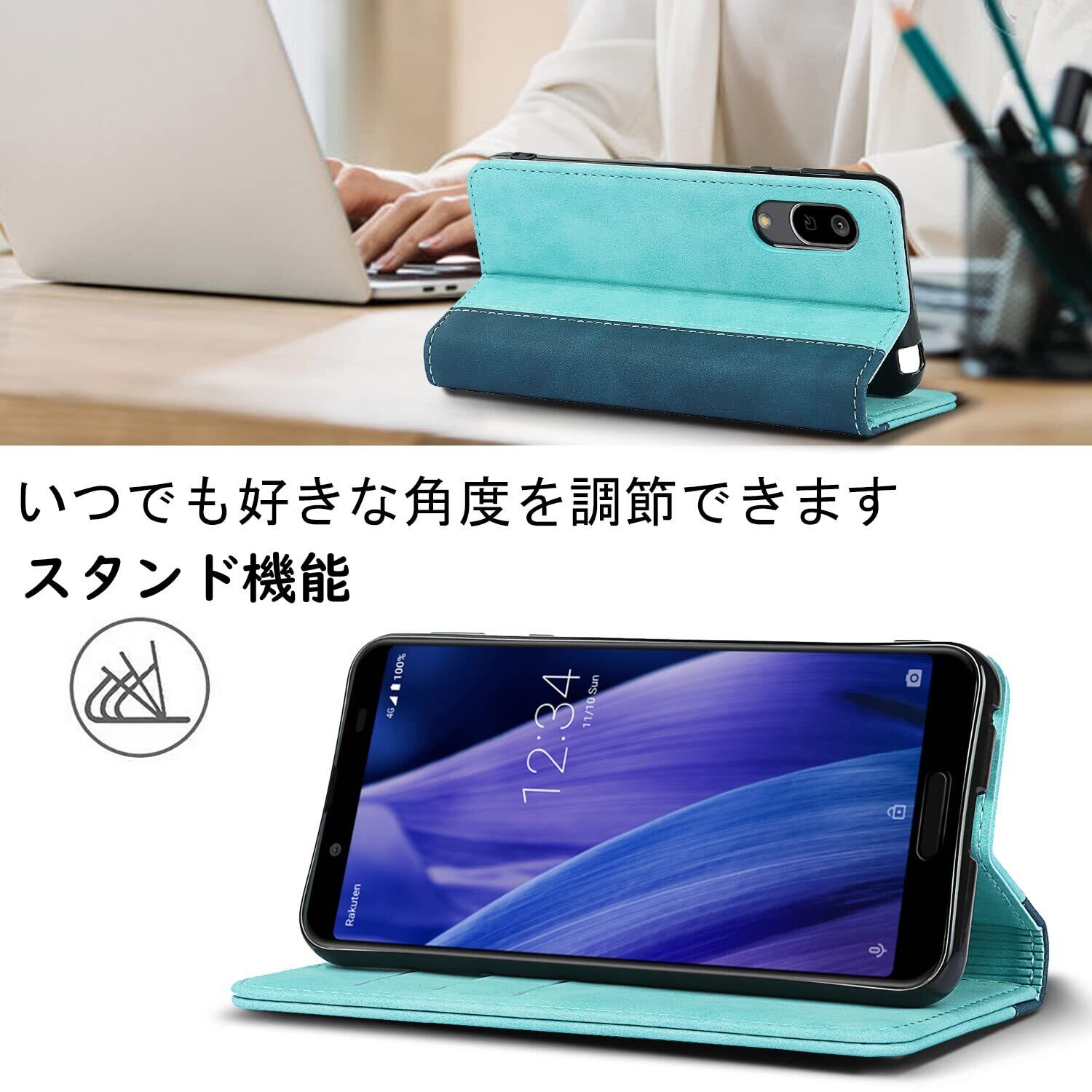 【収納機能】AQUOS Sense 3/Sense 3 lite/Android One S7ケース内部には三つのカードスロットとフリーポケットがあり、カード類や紙幣、名刺などを収納することができます。カードスロットに2枚のカードを入れると、内蔵マグネットの機能が最大限に発揮し、カードの消磁を防ぐことができます。また、横置きスタンド機能も搭載されています。これにより、横に寝かせて斜めに立て、角度を自由に調整することができ、動画鑑賞や読書などをお好みの角度で楽しむことができます。長時間の新幹線や飛行機の旅行での暇つぶしにも最適です。