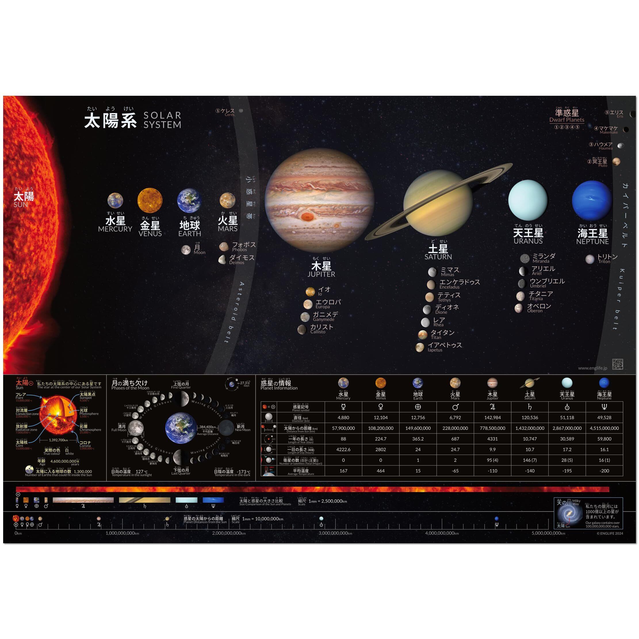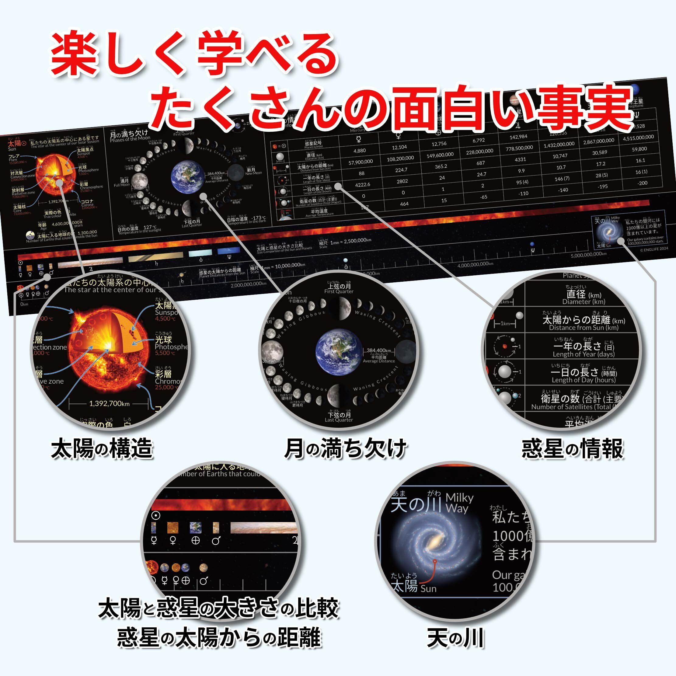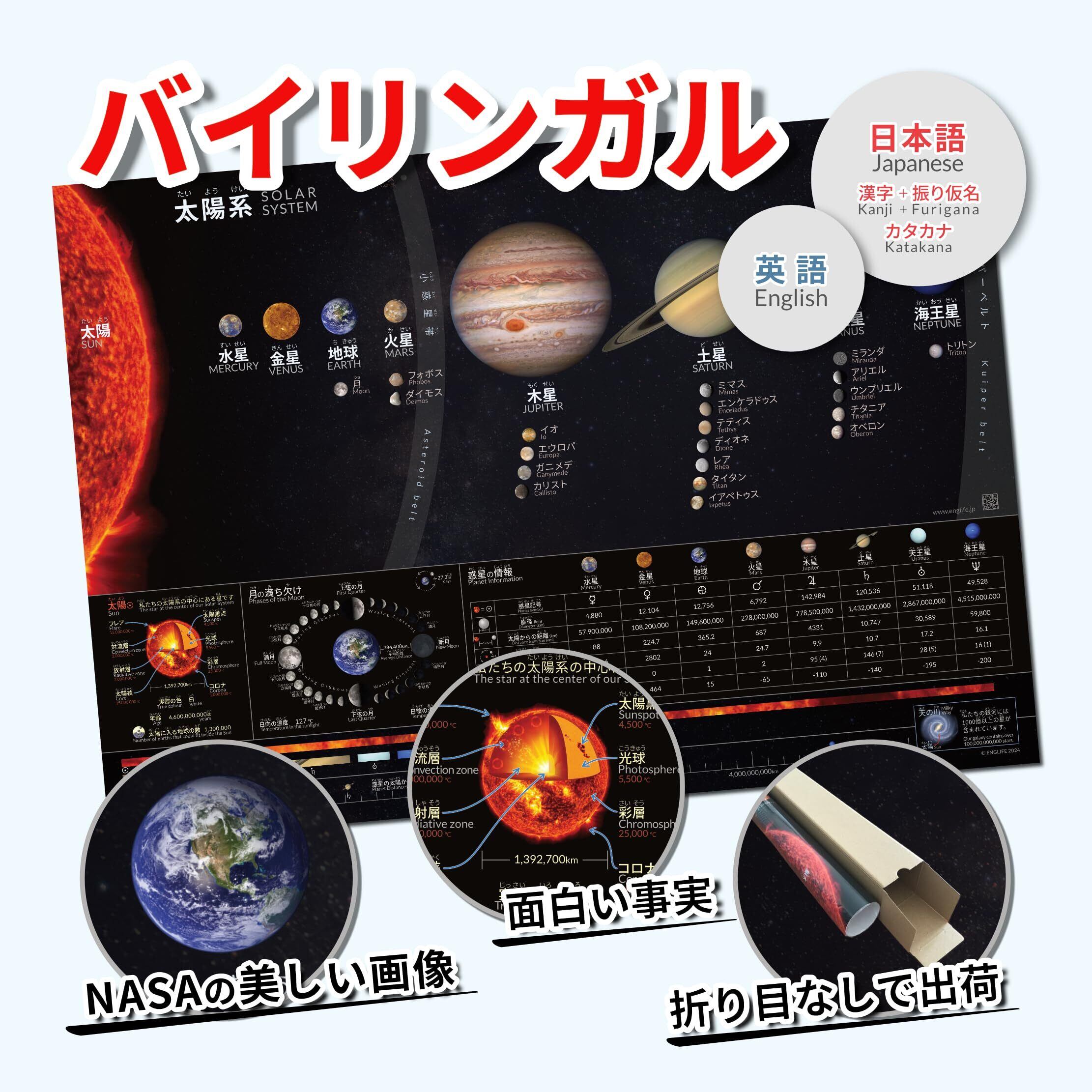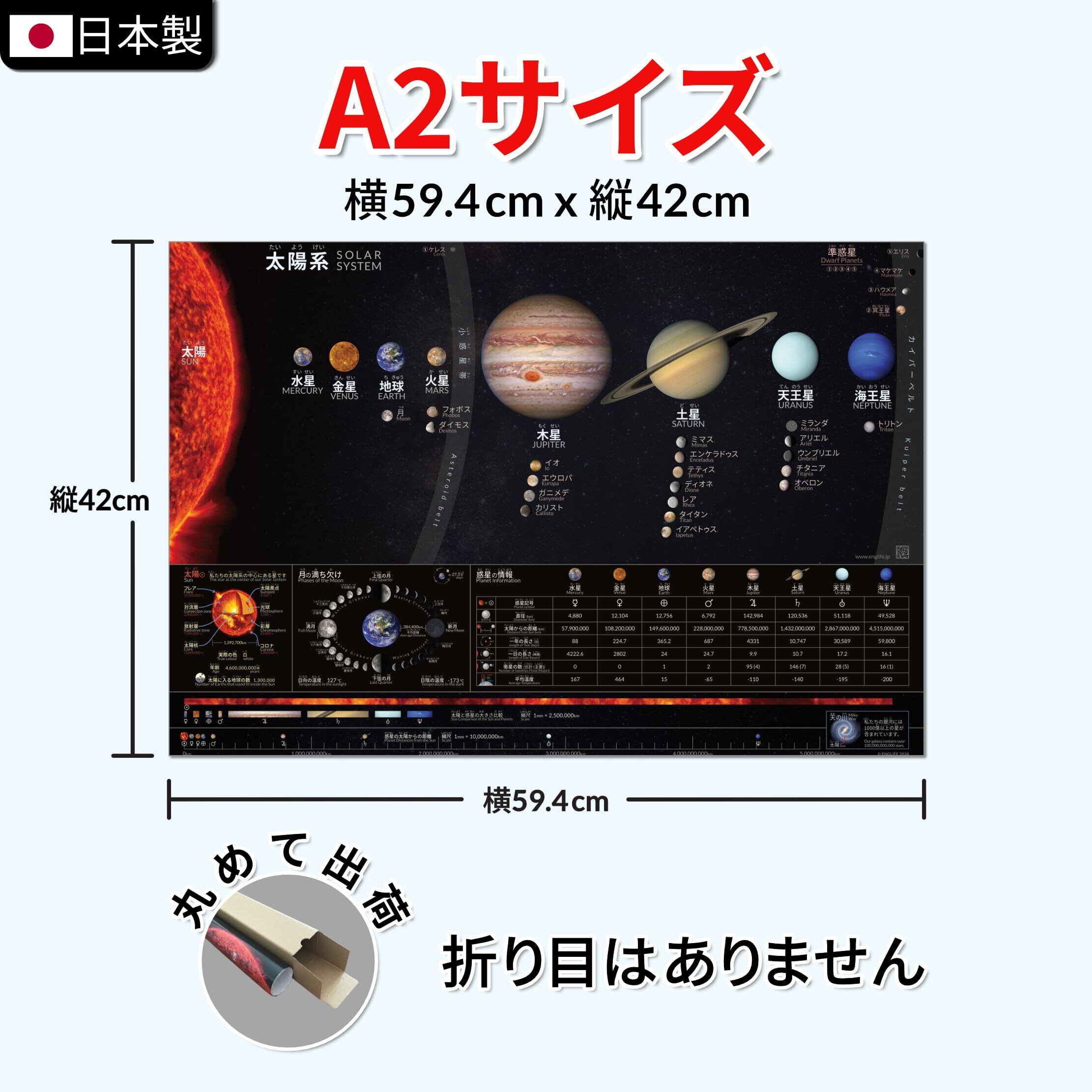 Englife 太陽系ポスター 宇宙 日本語と英語バイリンガル 日本製&折り目なし配送 A2サイズ(横59.4cm x 縦42cm)