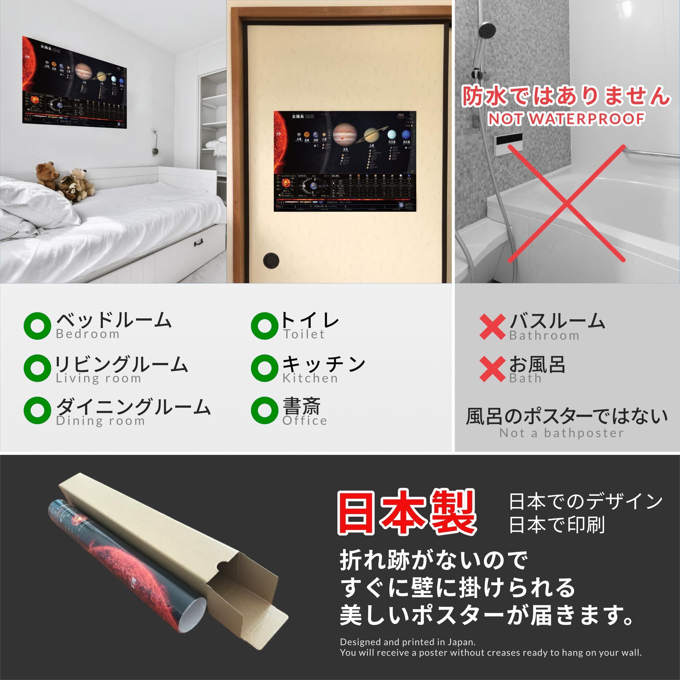 太陽系ポスターです。英語と日本語(漢字 + かな、カタカナ)のバイリンガルで表記されています。NASAの美しい画像を使用しており、八つの惑星、五つの準惑星、20の主要衛星、小惑星帯、カイパーベルトが含まれています。太陽は八層の温度情報、月は全ての満ち欠け周期が表示されています。一年の長さ、一日の長さ、平均温度などの事実を示す表があり、惑星の直径や太陽からの距離も縮尺で表示されています。銀河系の眺めも楽しめます。サイズはA2で、高品質ポスター紙を使用しています。ポスターは巻かれて梱包されており、しわなくすぐに飾ることができます。日本でデザインおよび印刷されています。