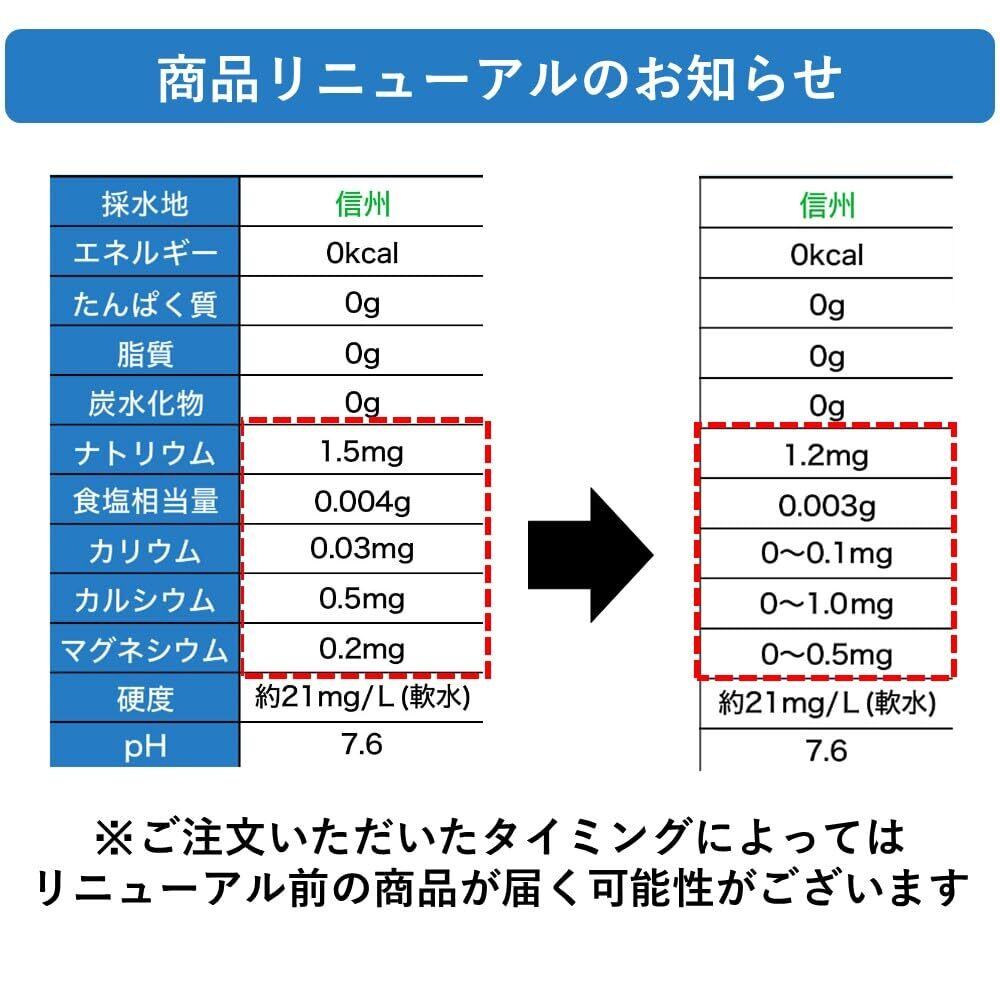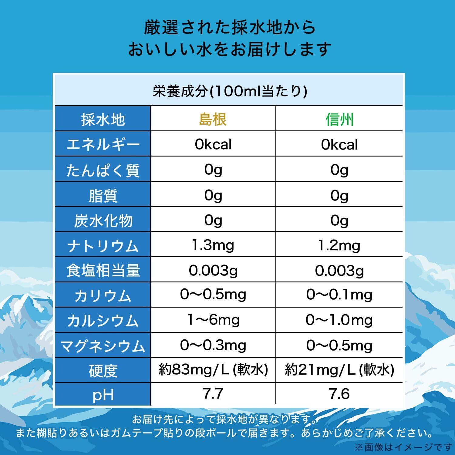 栄養成分(100ml当たり):【採水地:信州】エネルギー:0kcal、たんぱく質:0g、脂質:0g、炭水化物:0g、ナトリウム:1.5mg(食塩相当量:0.004g)、カリウム:0.03mg、カルシウム:0.5mg、マグネシウム:0.2mg、硬度:約21mg/L(軟水)、pH:7.6 【採水地:島根】エネルギー:0kcal、たんぱく質:0g、脂質:0g、炭水化物:0g、ナトリウム:1.3mg(食塩相当量:0.003g)、カリウム:0~0.5mg、カルシウム:1~6mg、マグネシウム:0~0.3mg、硬度:約83mg/L(軟水)、pH:7.7