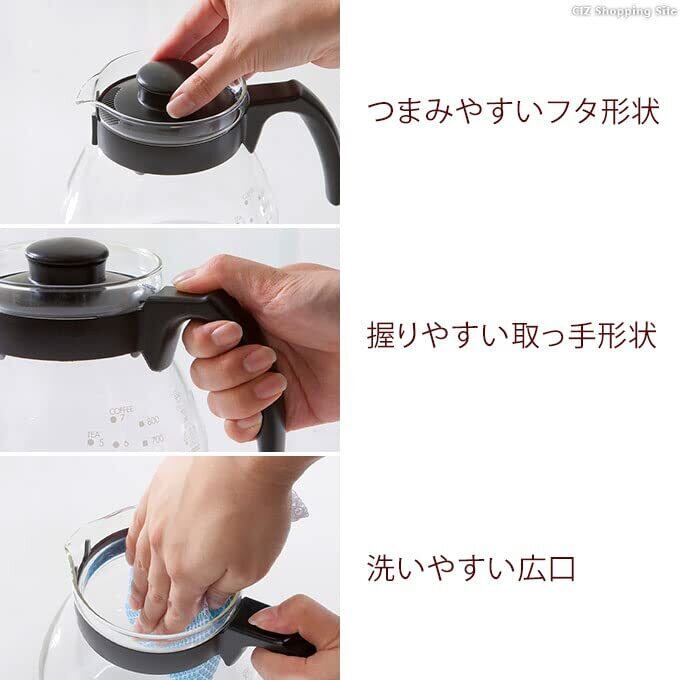 コーヒーのドリップに使いやすいシンプルなポット。持ちやすい取っ手と滑りにくいつまみのフタです。フタをしたまま電子レンジOK。セットでドリッパーが付いています。