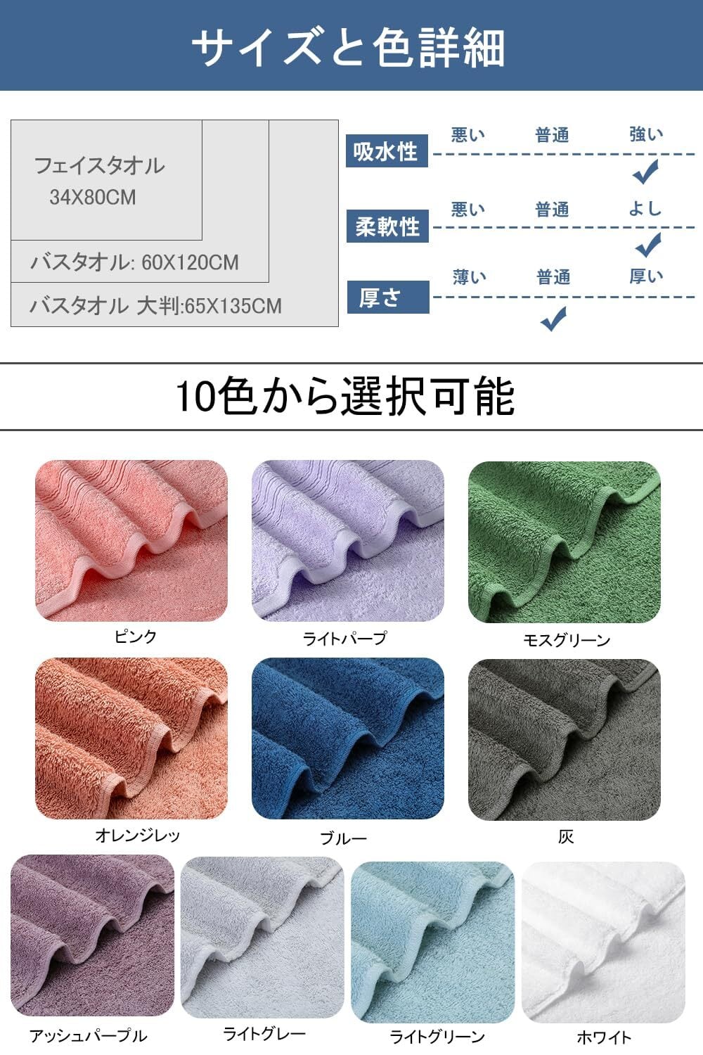 【高品質の綿フェイスタオル10枚セット】サイズ:約33×80cm、重量:約110g ,このバスタオルは、綿糸の中でも最高級の「コーマ綿」繊維を使用しており、長繊維を丁寧に加工することで、柔らかくしっとりとした肌触りを実現しました。掉毛が少なく、長期的な使用にも耐えられます。洗濯しても毛羽立ちが少なく、清潔感を保ちやすく、長くお使いいただけます。