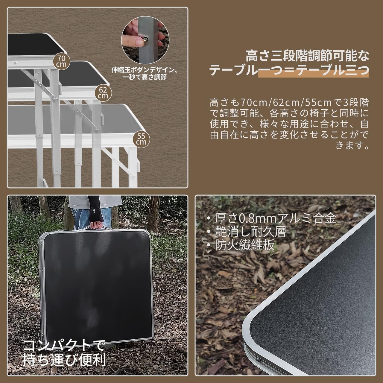 【素材】材質:フレーム/アルミニウム、他、天板/メラミン加工合板(抗菌加工) 。天板の耐熱温度は100℃まで達し、錆びにくく、水と熱にも強いので、鍋やフライパンなどの熱い物を置いたりご使用頂けます。おしゃれな見た目でお手入れも簡単、水や汚れもすぐ落ち、実用性と耐久性を両立しています。手触りがよく、滑り止めだけでなく美しい。人気の木目調素材を採用し、ナチュラルスタイルでよく馴染みます。お部屋でもキャンプでもこれひとつでばっちり。