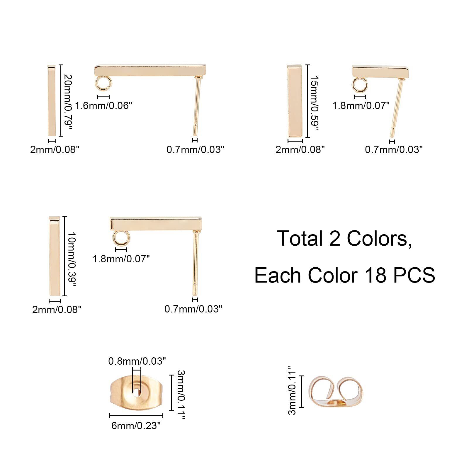 3サイズ:イヤリングポストの長さは約10/15/20mmです, 1.6/1.8mmの穴, 0.7mmピン, 各サイズ12pcs, 合計約36個, サイズ3x6x3mmのイヤーナット, 穴:0.8~1mm, 2色, 18個/カラー, パッケージに36個.