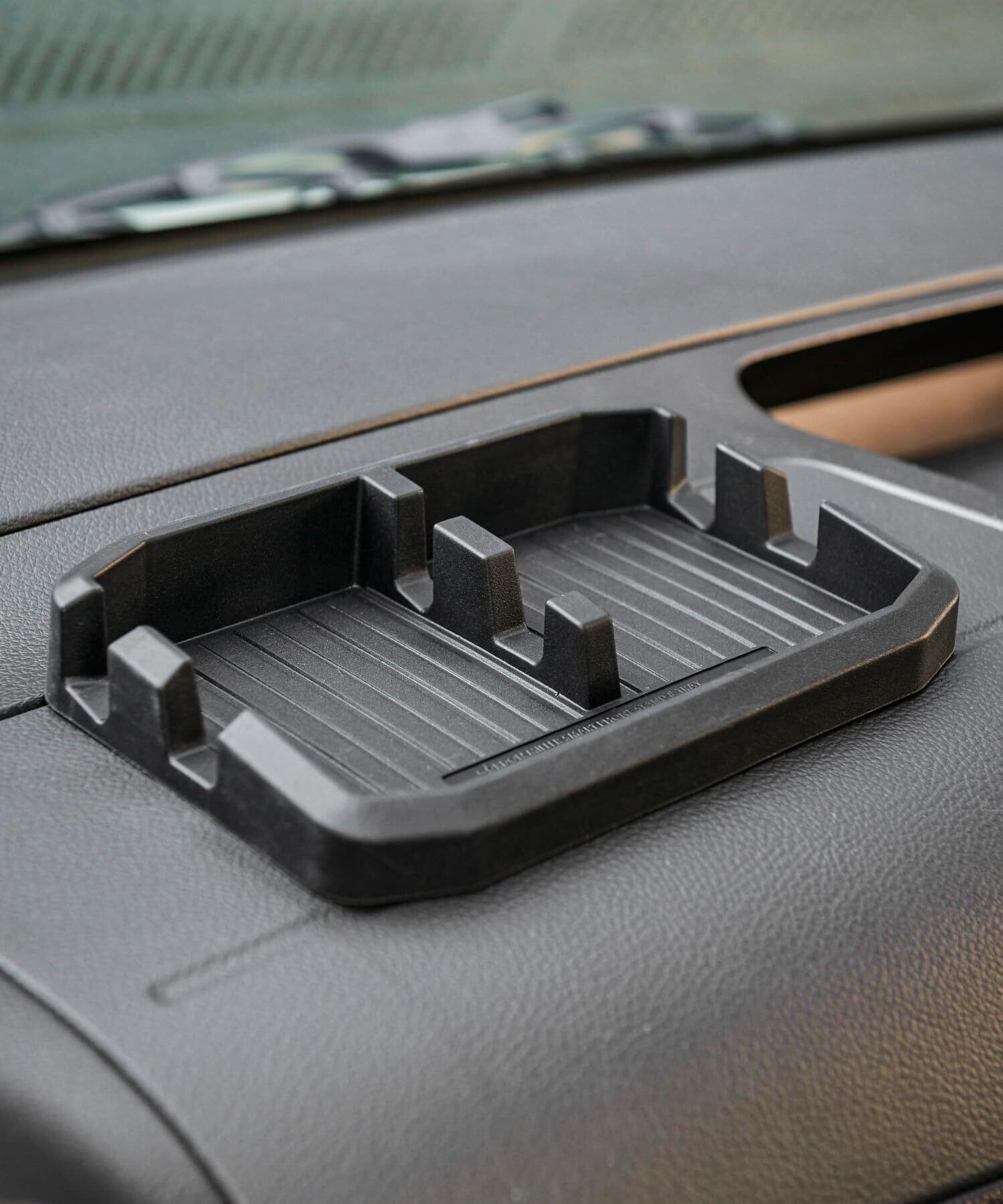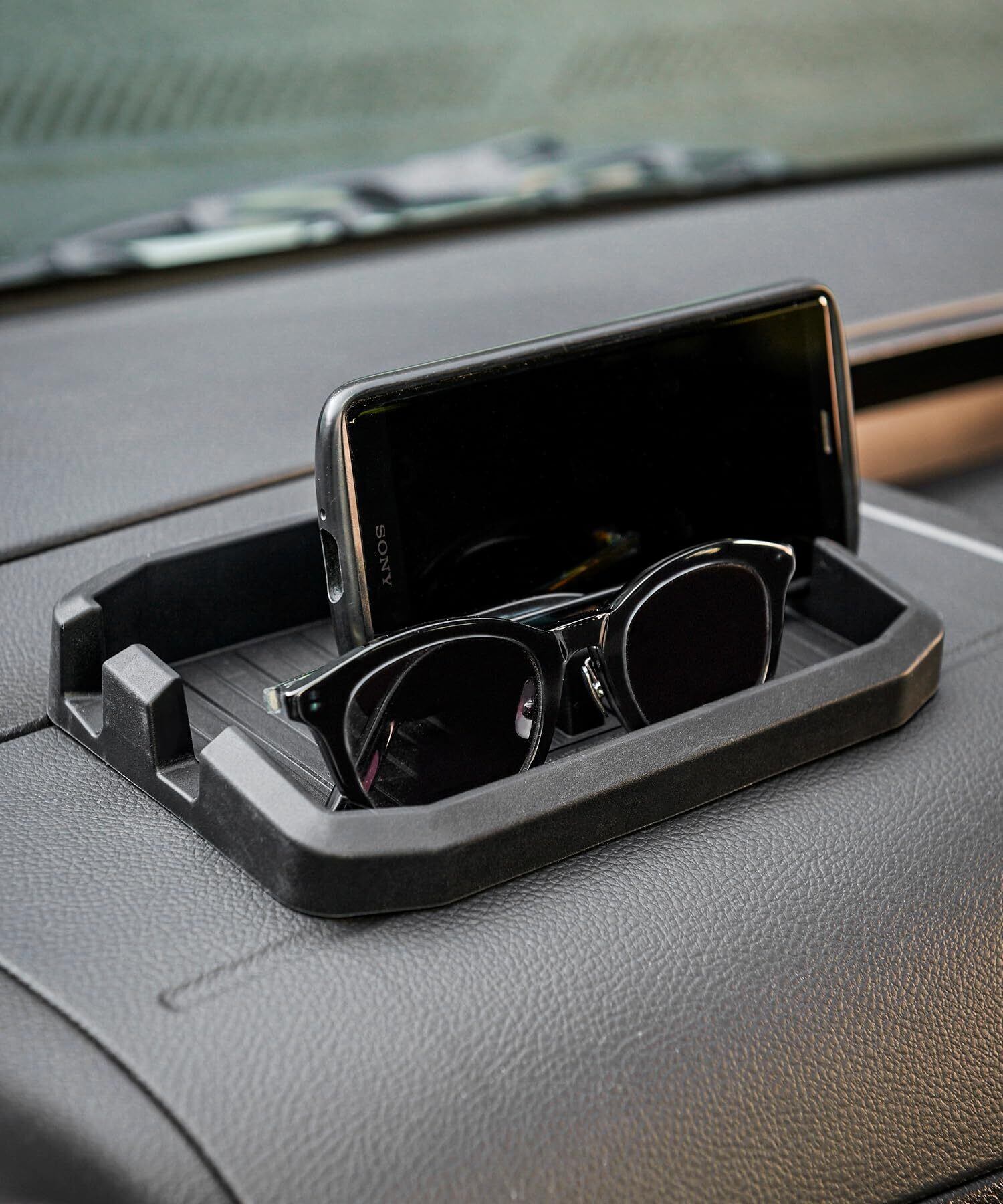 枠付きタイプで、置いた小物が落ちるのを防御。両面テープ不要でダッシュボードに置くだけで固定できます。