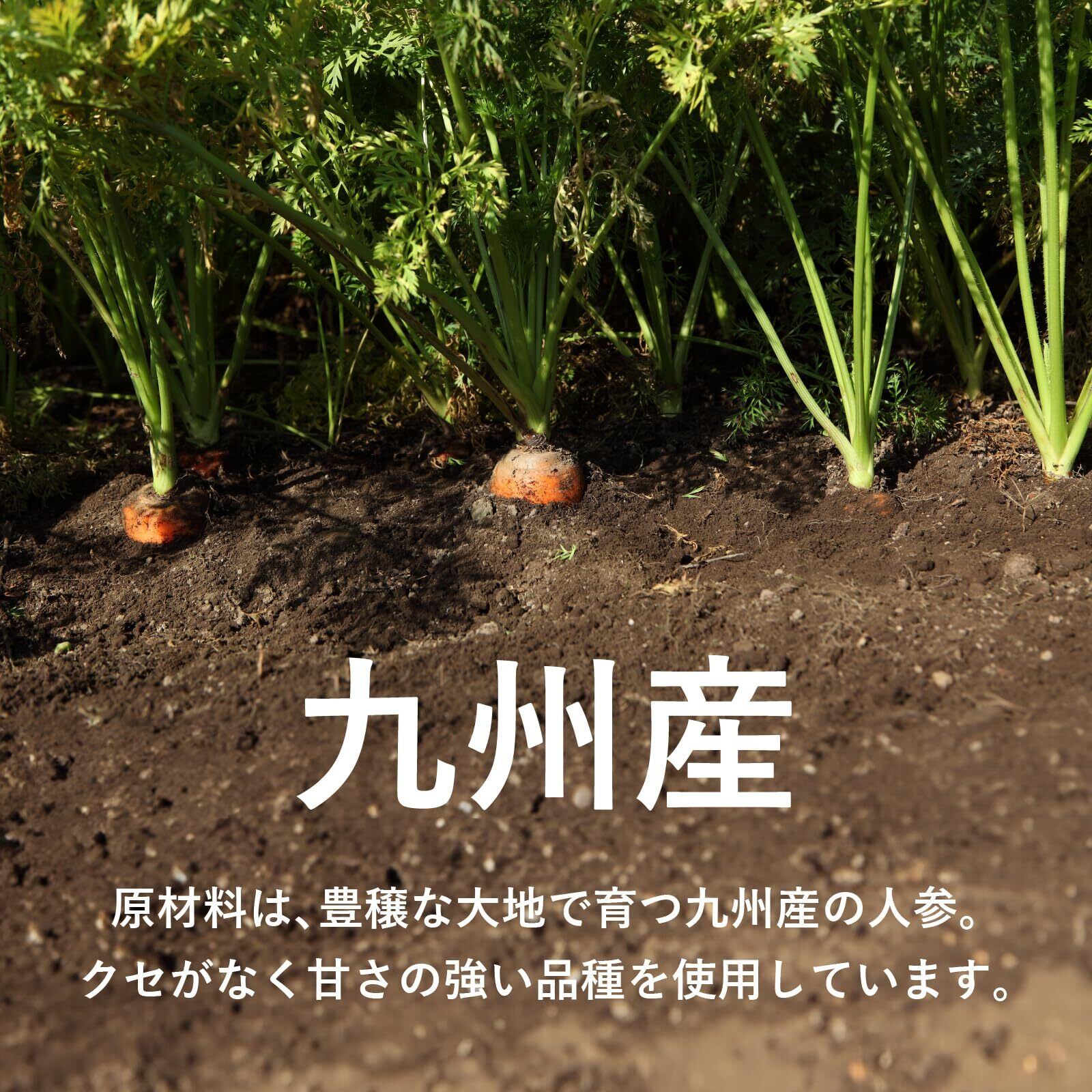 12~3月の寒い時期に収穫した九州産の人参だけを使用した人参100%ジュースです。冬に収穫した人参は青臭み・えぐみが弱く、甘みがあって飲みやすいのが特長です。2人参2本分使用しており、200mlあたりのβカロテンは9,596㎍。酸味料やレモン果汁を使用していないので料理にもご使用頂けます。冷やすとより美味しくお飲みいただけます。