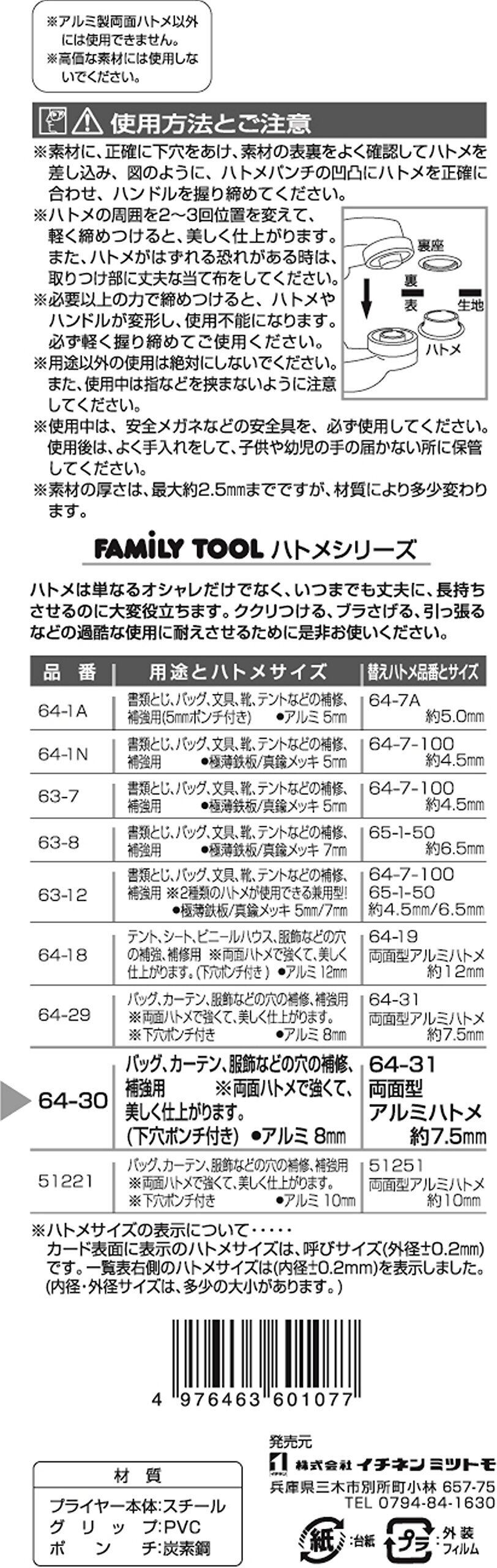 イチネンアクセス ツール事業部 イチネンアクセス FAMILY TOOL(ファミリーツール) ハトメ 64-30 両面ハトメパンチ #22/8mm 60107 アルミ製20組付 | BASE SHOP