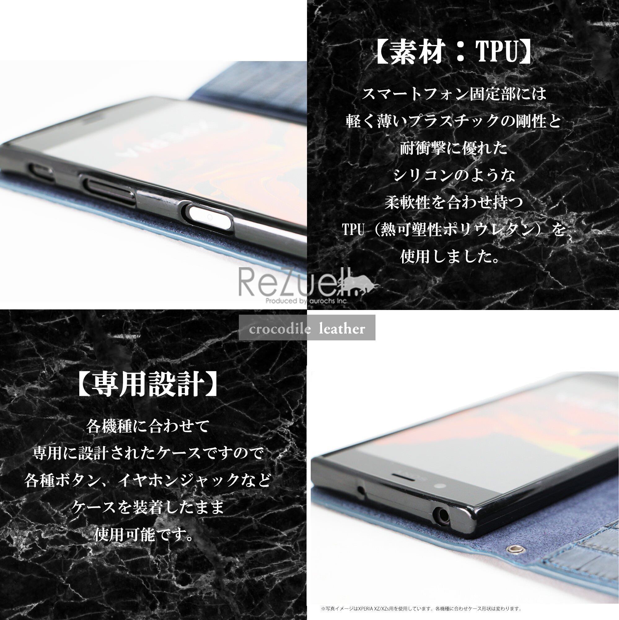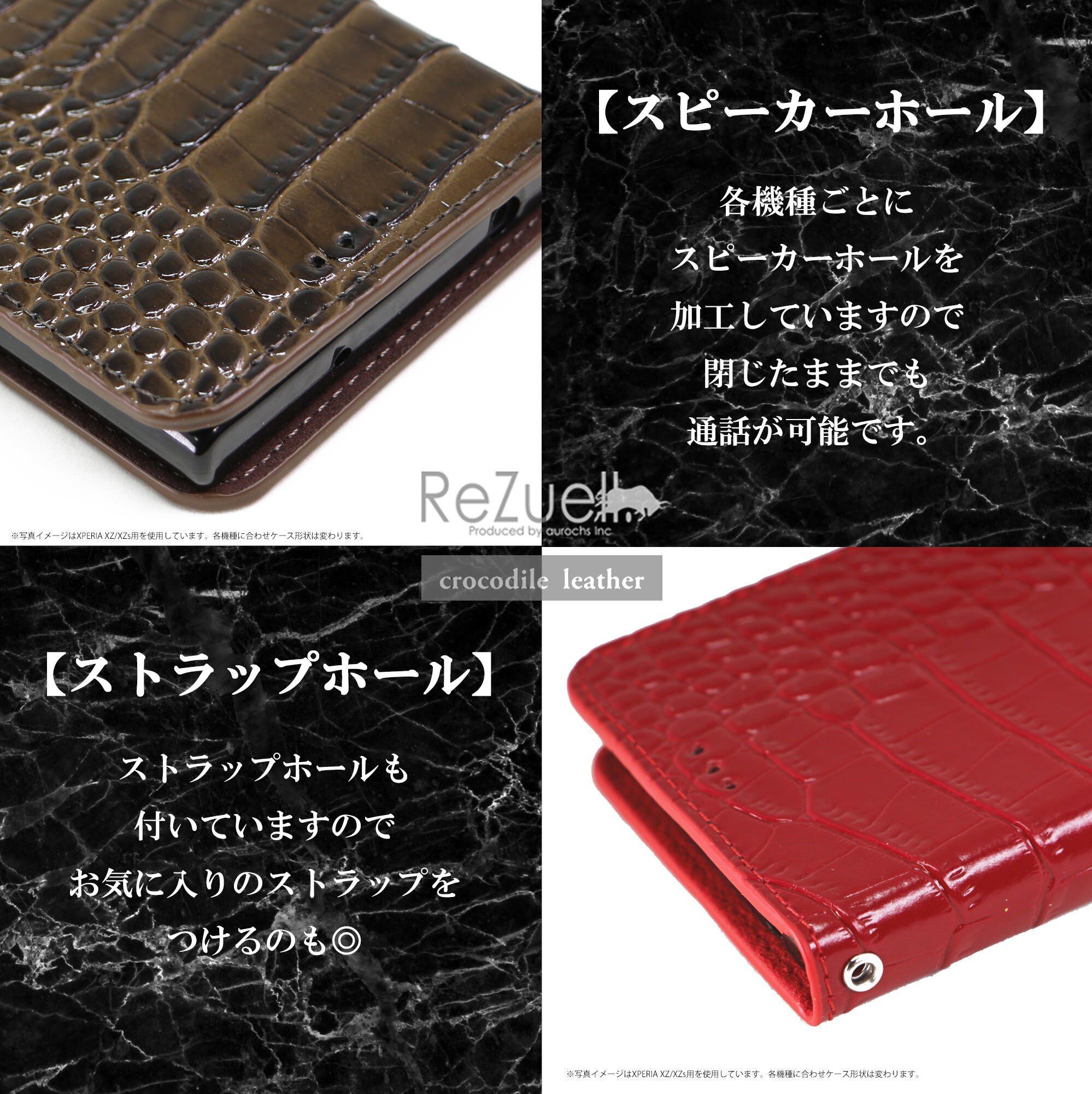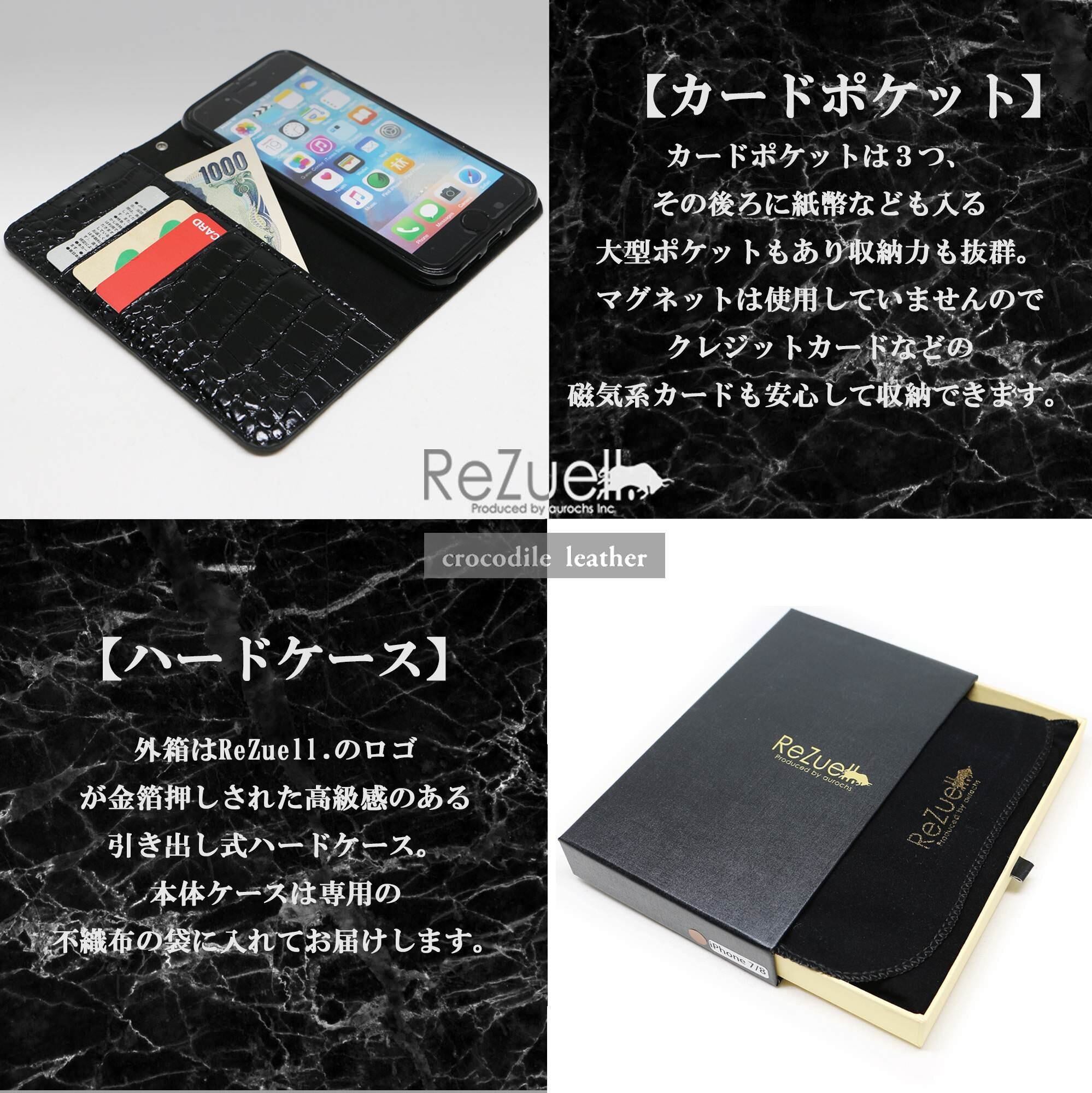 ReZuell.オリジナルクロコダイル調手帳型フルカバーレザーケース。スタイリッシュでシンプルなクロコダイル調デザインで男女問わず人気のデザインです。 カメラ、イヤホンなどはケースに入れたまま使用可能。 ディスプレイも保護するフルカバータイプ。 内側も外側と同素材を使用し、開いた状態でもデザイン性を損ないません。 表面はクロコダイル調のテクスチャーを型押ししたスプリットレザー(牛床革)を使用、ワニ皮をリアルに再現し手触りも良く、長くご愛用いただけます。カードポケットは3つ、その後ろに紙幣なども入る大型ポケットもあり収納力も抜群です。ストラップホールも付いていますのでお気に入りのストラップをつけるのも◎ ケース部分は専用設計されたTPU素材になっておりしっかりと本体をホールドします。専用の高級感のあるReZuell.オリジナルハードケースに入れてお届けします。プレゼントにも最適です! ※照明や、ディスプレイ環境により実物の色味と若干異なる場合がございますので、あらかじめご了承の上ご購入下さい。
