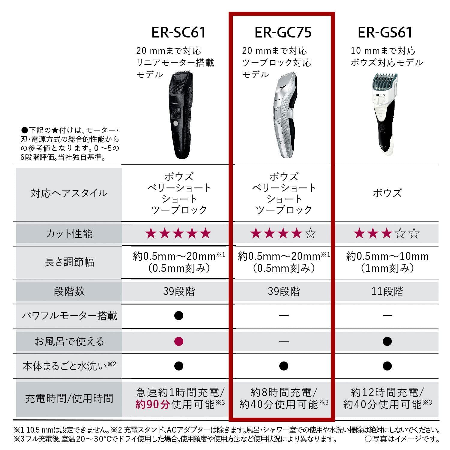 ※2 当社2011年発売ER-GC50に対して刈り残し高さ同等になる刈りスピードとの比較(当社調べ、当社独自基準に基づく)。 ※3 ACアダプターは除きます。風呂・シャワー室での使用や水洗い掃除は絶対にしないでください。<br> ※4 IPX7基準(水深1メートルに30分間水に浸けても有害な影響を生じる量の水の浸入がない)検査をクリアしています。