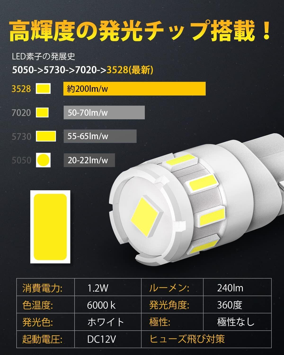 【T10 LED 爆光】2023最新の高発光効率のLED素子10連搭載、明るさ1個240LMで純正バルブに比べて300% 明るさUPします!市販品より2倍以上のルーメン数、極の明るさが実現します。純正ホワイトの発光していて、夜の車内照明をやさしくなれます。