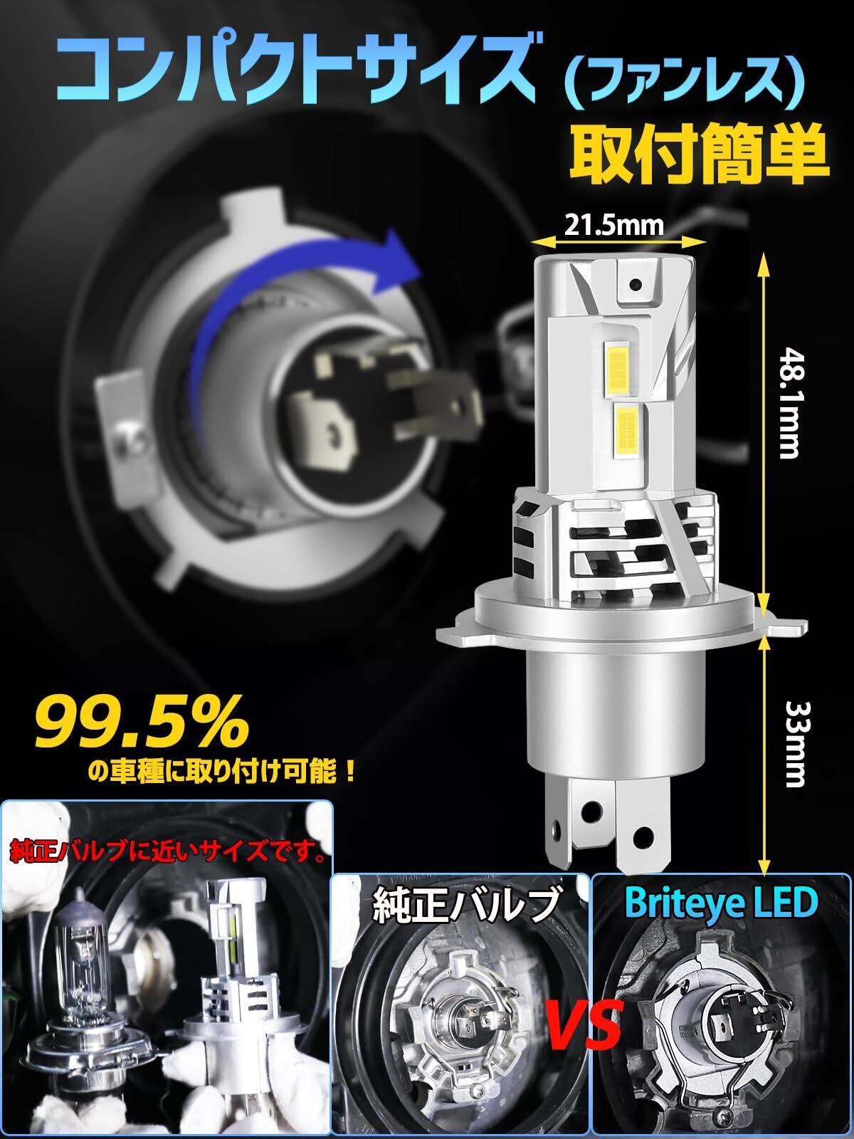 【商品 スペック・Briteye正規品】型番:H4バルブ専用(LED ハイビーム用/ロービーム用切替)/ケルビン数:6500K ホワイト/対応電圧:DC9V-18V/消費電力約30W(片方)/寿命:約50000時間以上/セット内容:LEDヘッドライトh4 2個入