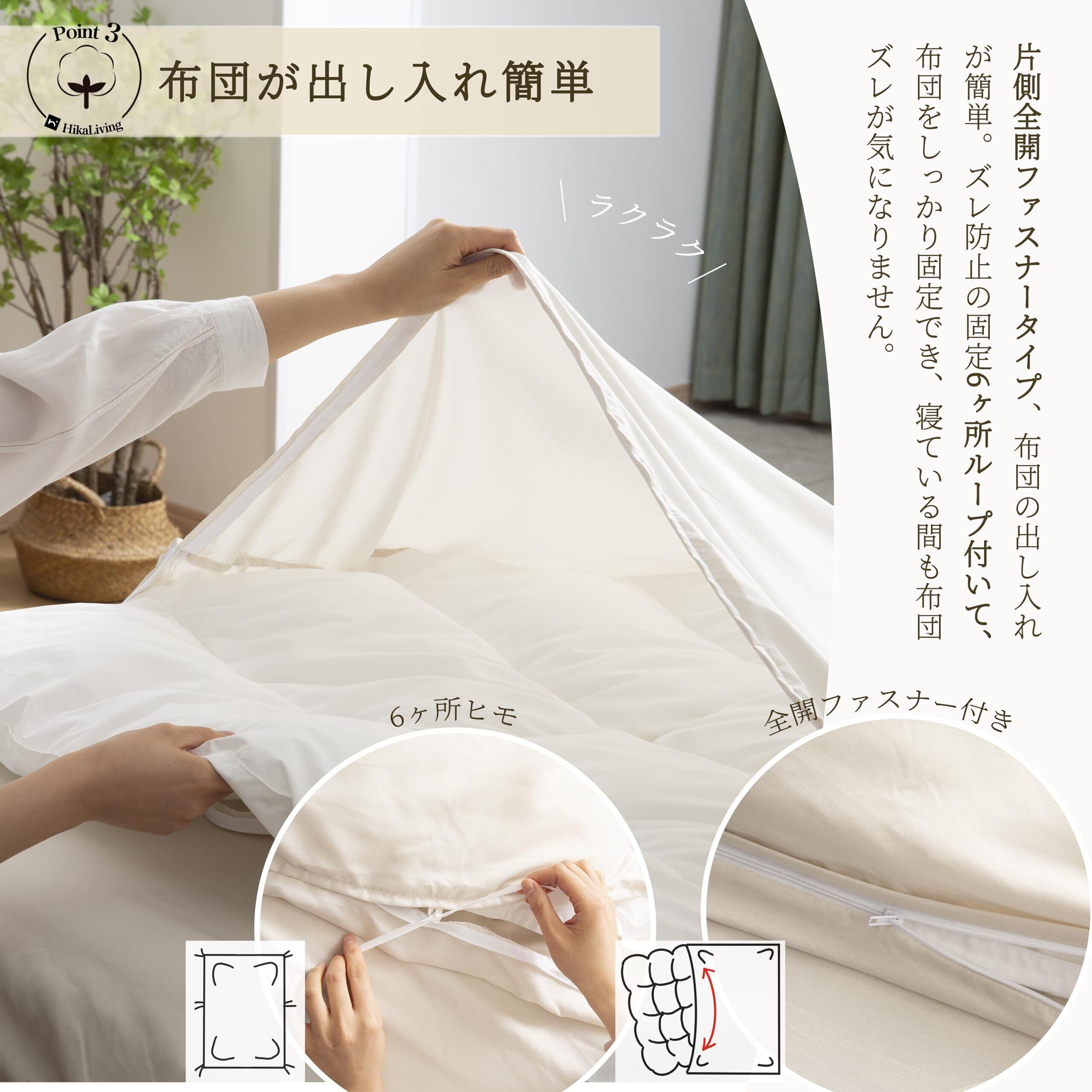 【シングル】サイズ:150×210㎝ 素材:ポリエステル100% 片側全開ファスナータイプ、布団の出し入れが簡単。ズレ防止の固定6ヶ所ループ付いて、布団をしっかり固定でき、寝ている間も布団ズレが気になりません。