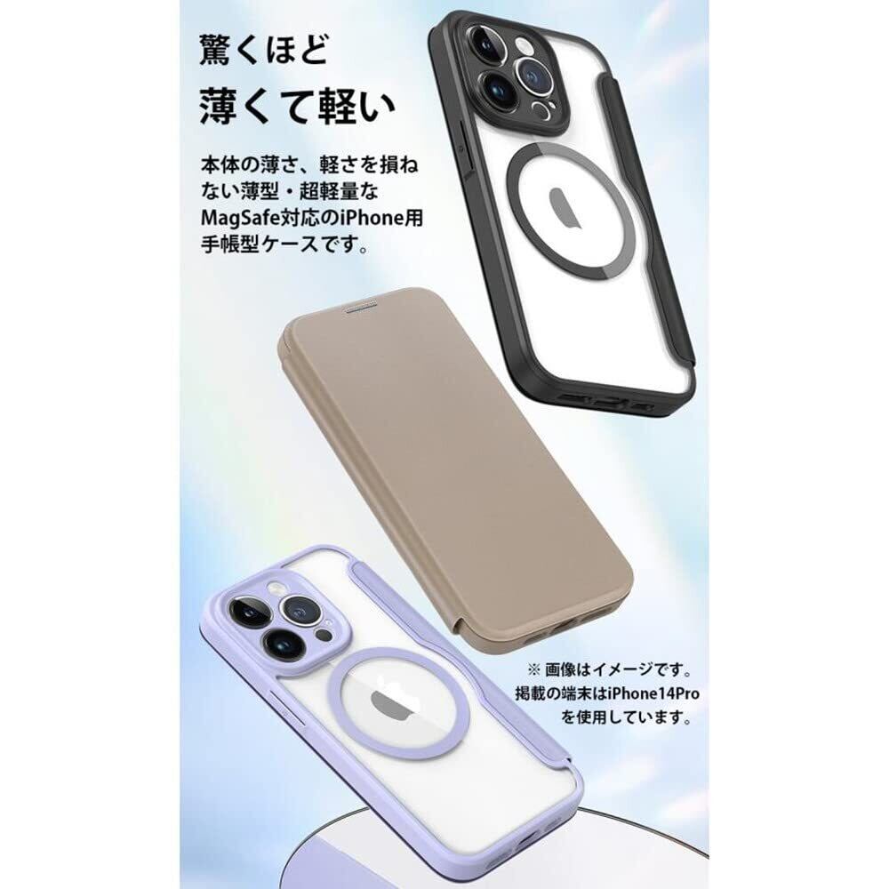 本体の薄さ、軽さを損ねない薄型・超軽量なMagSafe対応のiPhone 用手帳型ケースです。