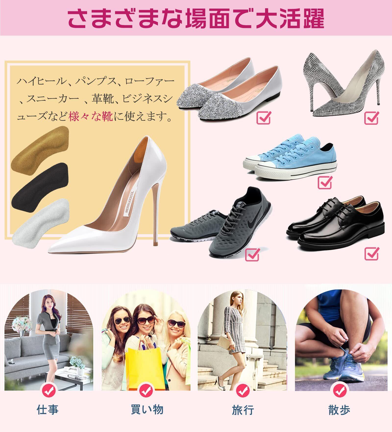 スーニーか、革靴、ハイヒール、パンプス、ローファー、ビジネスシューズなど様々な靴に使えます。パカパカ・靴擦れ防止用。サイズが合わない靴に貼るだけでかかとの隙間を解消し、靴のサイズが調整可能です。