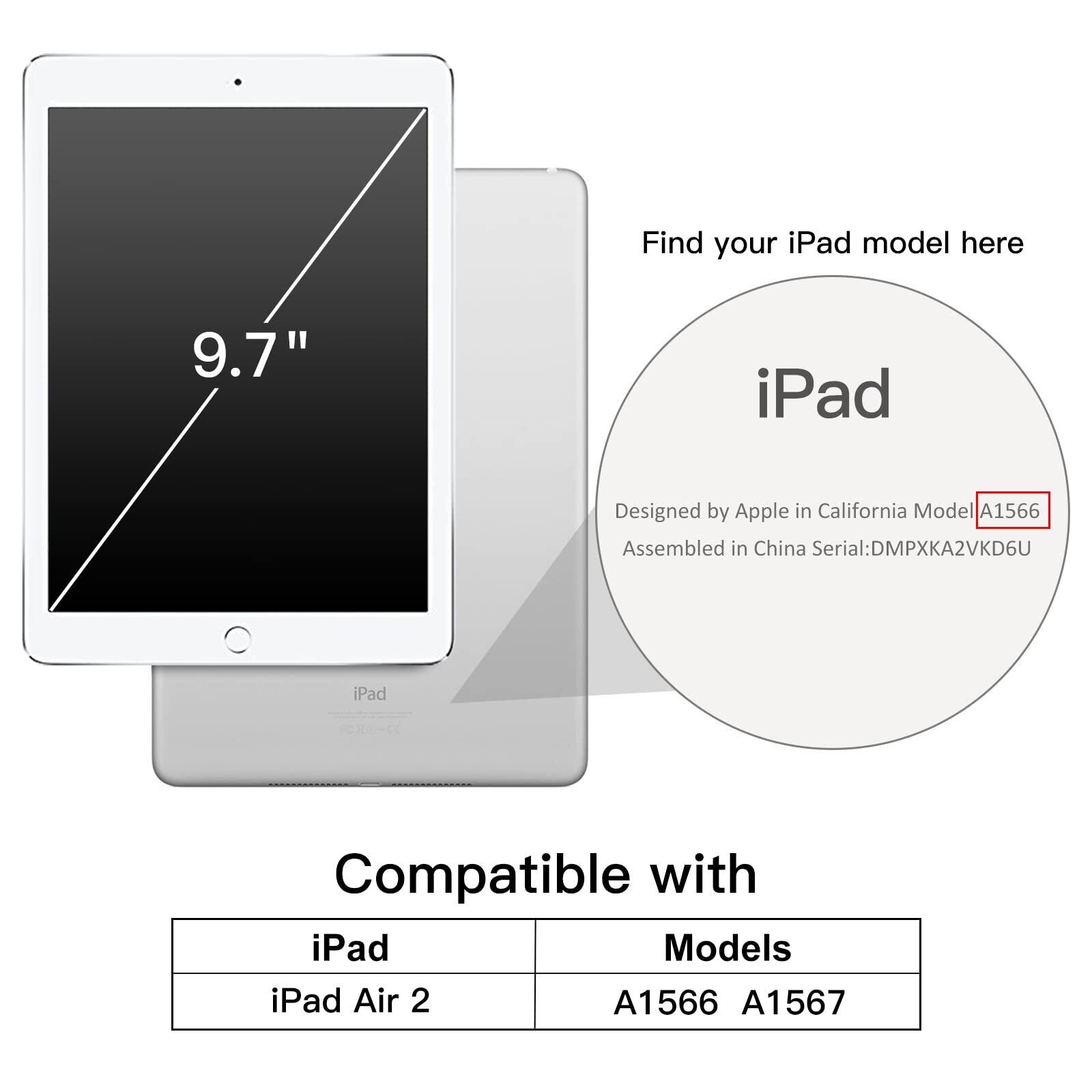 iPad Air2 ケースのために専門設計。ご購入の前、iPadの機種をご確認お願いいたします。ご購入の前、おデバイスの裏面にあるモデル番号をご確認ください。(それだけ対応モデル:A1566/A1567)ご注意ください:他のiPadモデルには適合しません