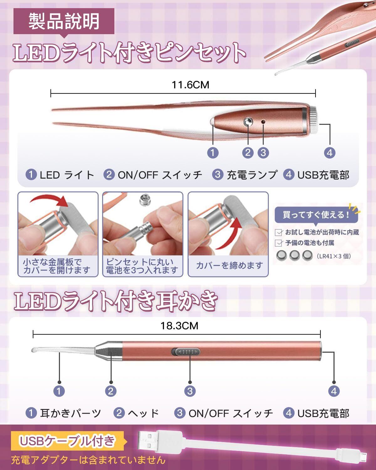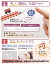 【耳かき】: LEDライトで耳内部を確認しながら掃除可能。大人用と子供用でサイズが異なるため、大小1つずつの耳かきパーツを同梱。
