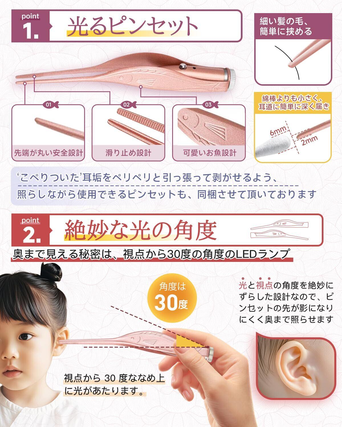 【ピンセット】: LEDライトで耳穴を照らし、耳垢を直感的に除去。繊細な作業に適したピンセットタイプで、お子様の耳を刺激しません。可愛い魚型デザイン。