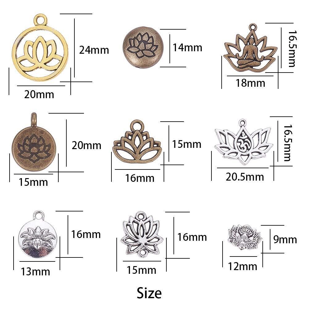 【サイズと数量】:ロータスペンダント*60個15種:最大のは24x20x1.5mmで、最小のは9x12x4mmです。箱*1つ:7.4x7.2x1.7mm.