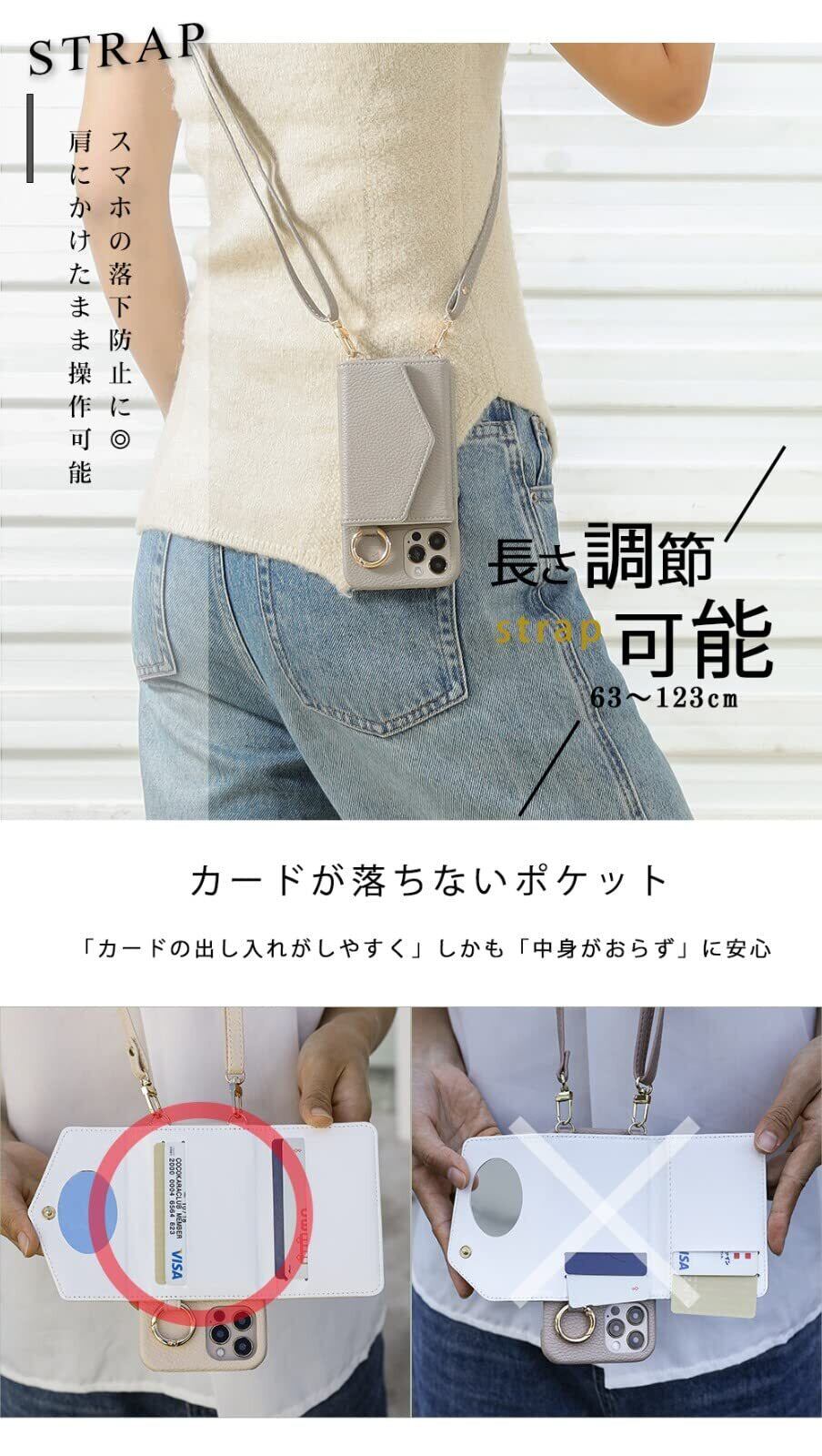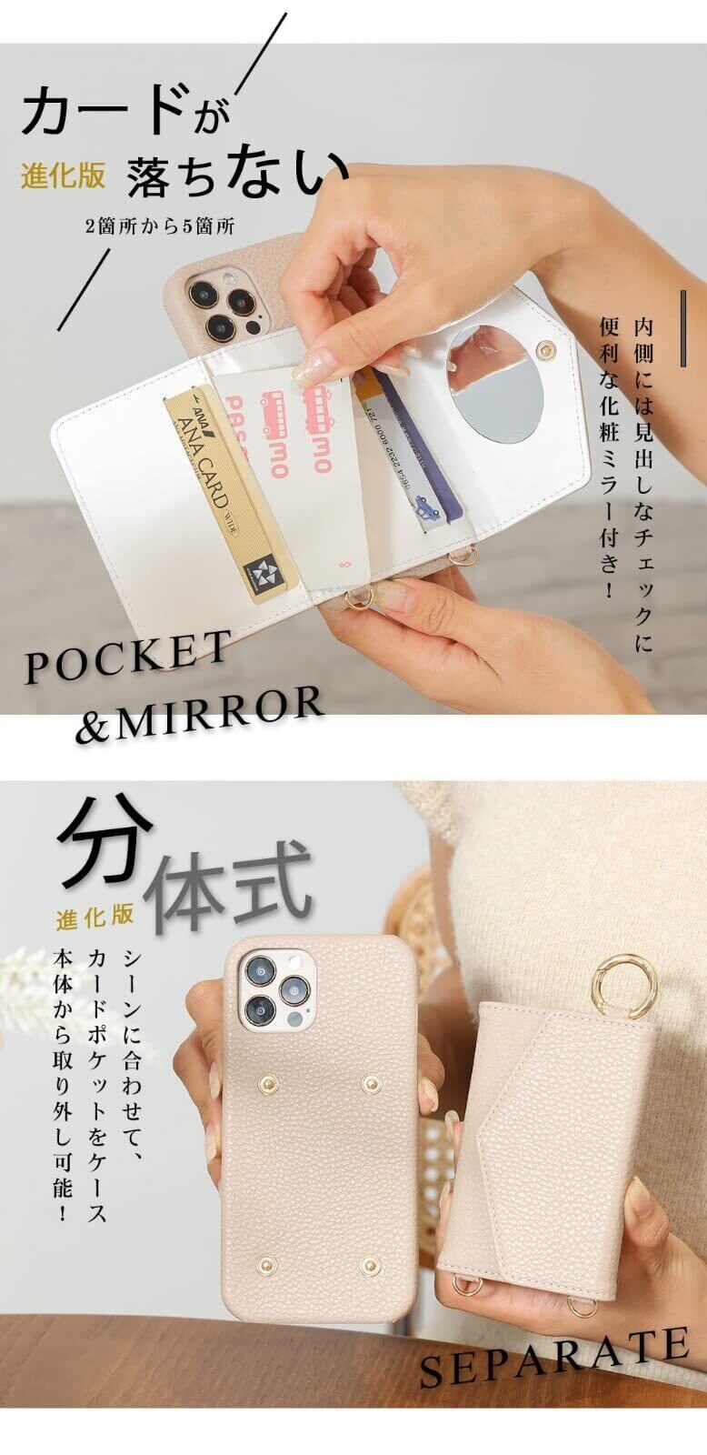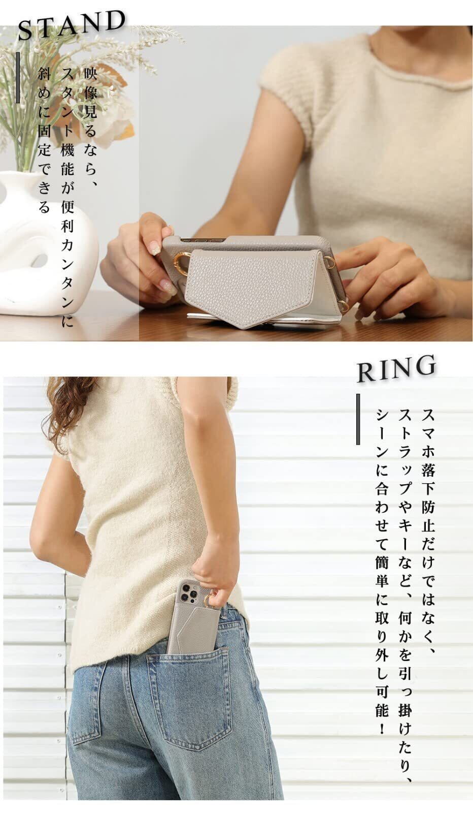 こだわりのデザイン:■ショルダーストラップ付き ■全8色 ■マグネットなし ■カード5箇所収納あり ■スピーカーホール付き ■スタンド機能 ■リング付き ■分体式