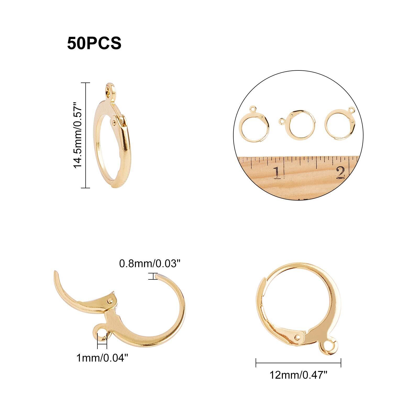 サイズ&内容:ピアスパーツ:幅:12mm、長さ:14.5mm、穴径:1mm;ピン:0.8x1mm、50個入り;色:ゴールド;あなたの想像力でこれらのレバーバックフックをDIYのファッションアクセサリーに使うことができます!