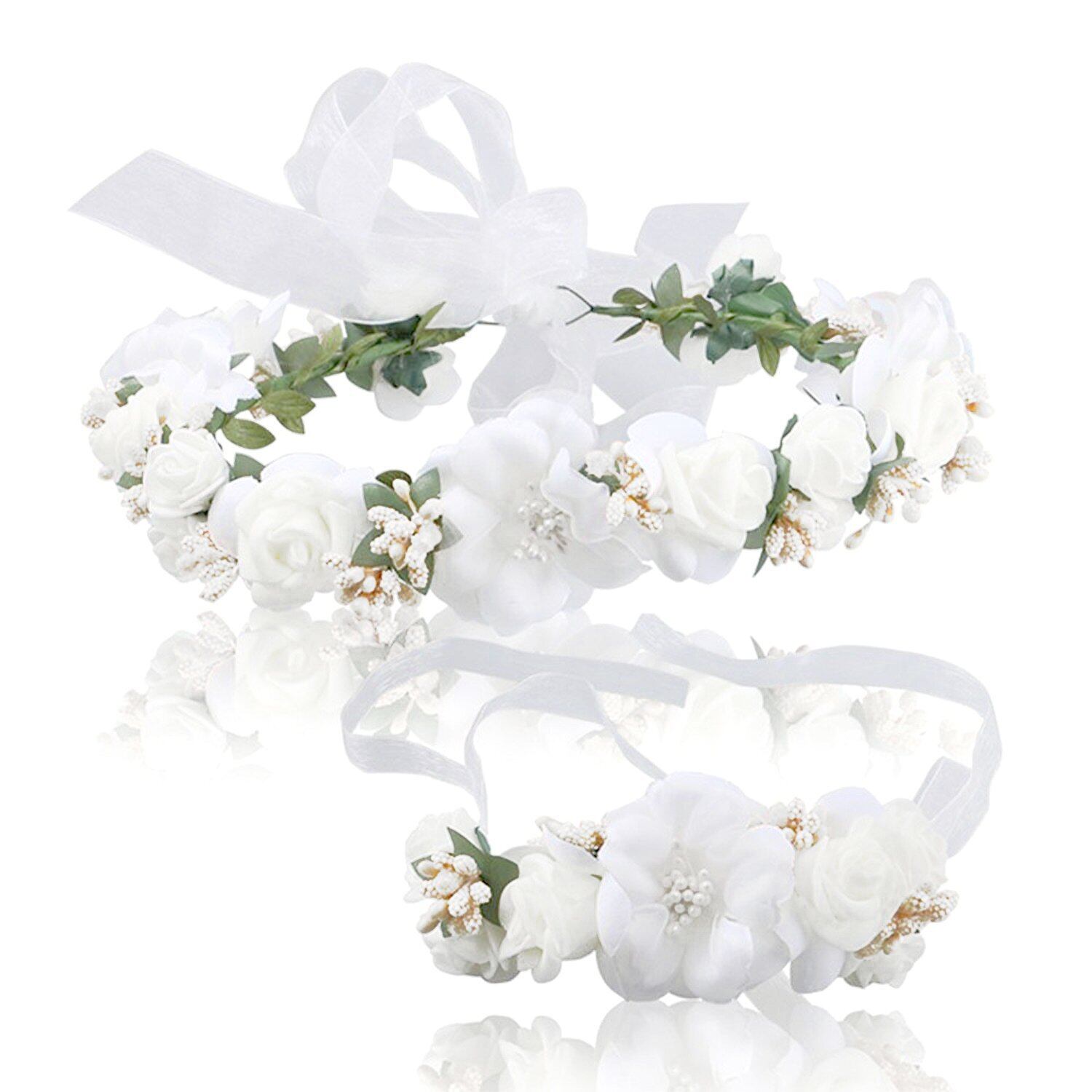新婦人 花冠 腕輪 2点セット 花かんむり 髪飾り ウェディング 小物 ヘアアクセサリー ブライダル ヘッドドレス 花嫁 発表会 花 髪飾り (ホワイト)