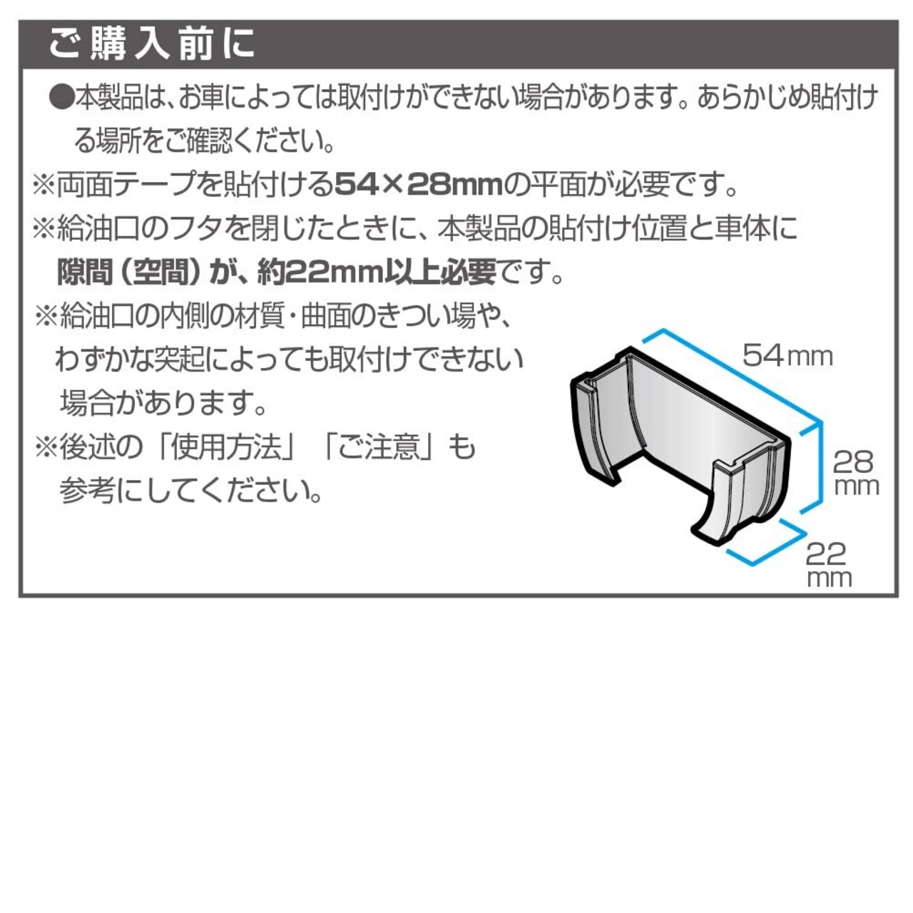 セルフガソリンスタンドでの燃料キャップの置き忘れを未然に防ぐ。セルフガソリンスタンドでの燃料キャップの置き忘れを未然に防ぐ:燃料キャップコードのぶら下がりで、燃料キャップがボディに当たることを防げる:近年増えている、マグネットが付かない樹脂リッドにも取付け可能:燃料の間違いを防ぐ油種ステッカー(レギュラー / ハイオク / 軽油)付き:耐油性に優れ、安心して使えるナイロン樹脂製。