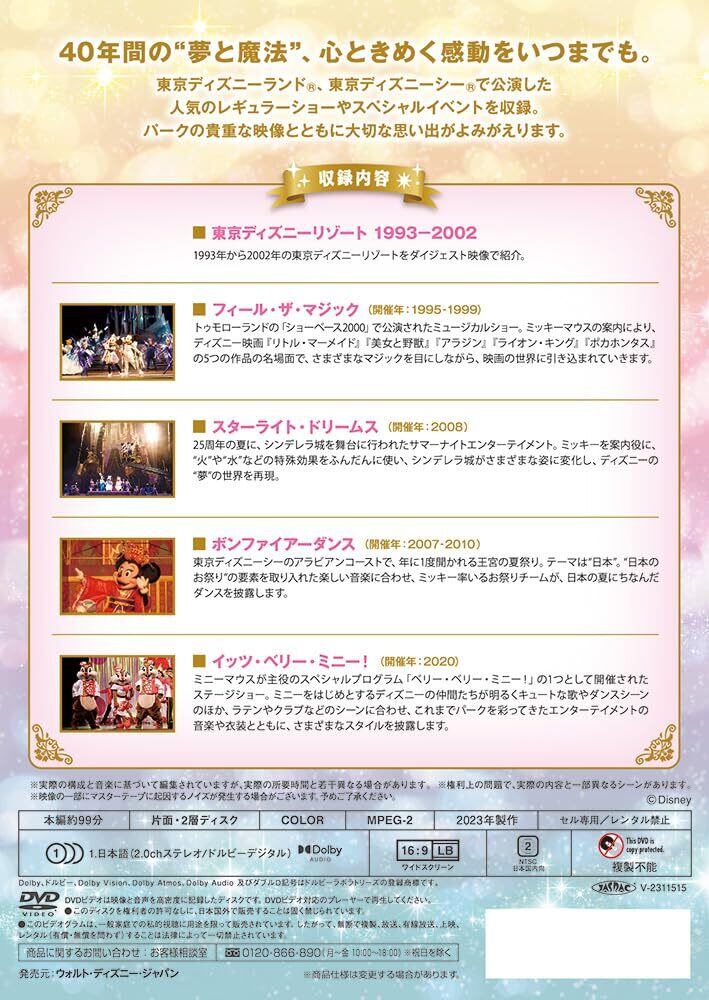 1983年の開園から40周年を迎えた東京ディズニーリゾート。東京ディズニーランド(R)、東京ディズニーシー(R)で公演したレギュラーショーやスペシャルイベントをセレクトして収録。登場するキャラクターやキャストのパフォーマンスを最大限に、演出を極力カットせずに編集。初収録のショーもあり、臨場感あふれる貴重な映像が満載。