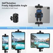 360°調整可能な角度-この三脚用iPadマウントには、高品質で耐久性のあるスイベルメタルボールヘッドが付属しており、縦向きと横向きの間でタブレットの角度を回転または調整して、さまざまな角度でのニーズを満たすことができます。 PS: 三脚スタンドは含まれません。