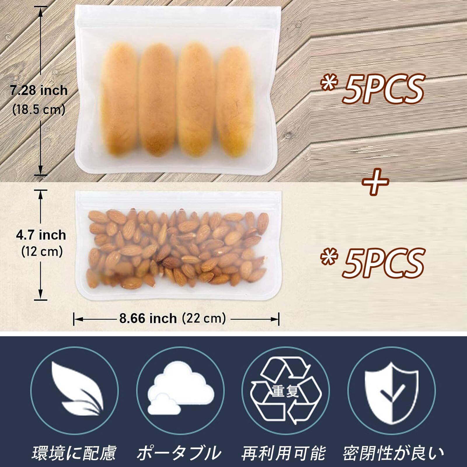食品保存袋のサイズ:5個大きいサイズ(21.5*12cm/8.46*4.72インチ)+5個小さいサイズ(21.5*18cm/8.46*7.08インチ)