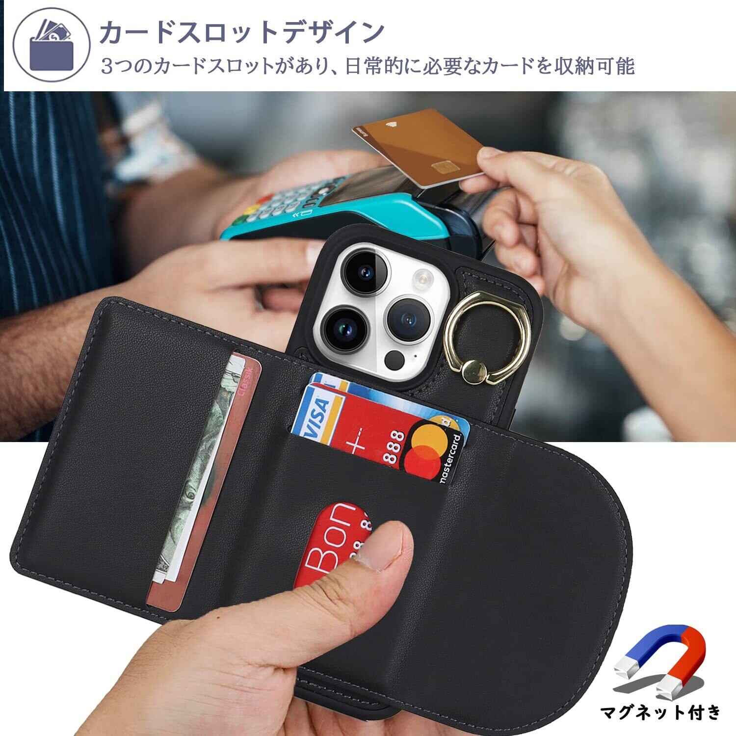 【カードケース】:ケース背面ににカードケースが付いている、カードを3枚収納できる。たとえば、スイカカードなどの毎日の重要なカードや現金は簡単に保管できます。iPhoneシリーズ専用に設計されているので、ケースを装着したまま、音量ブボタン、カメラ、コネクターなどのを自由に使えます。実用性が高いです。