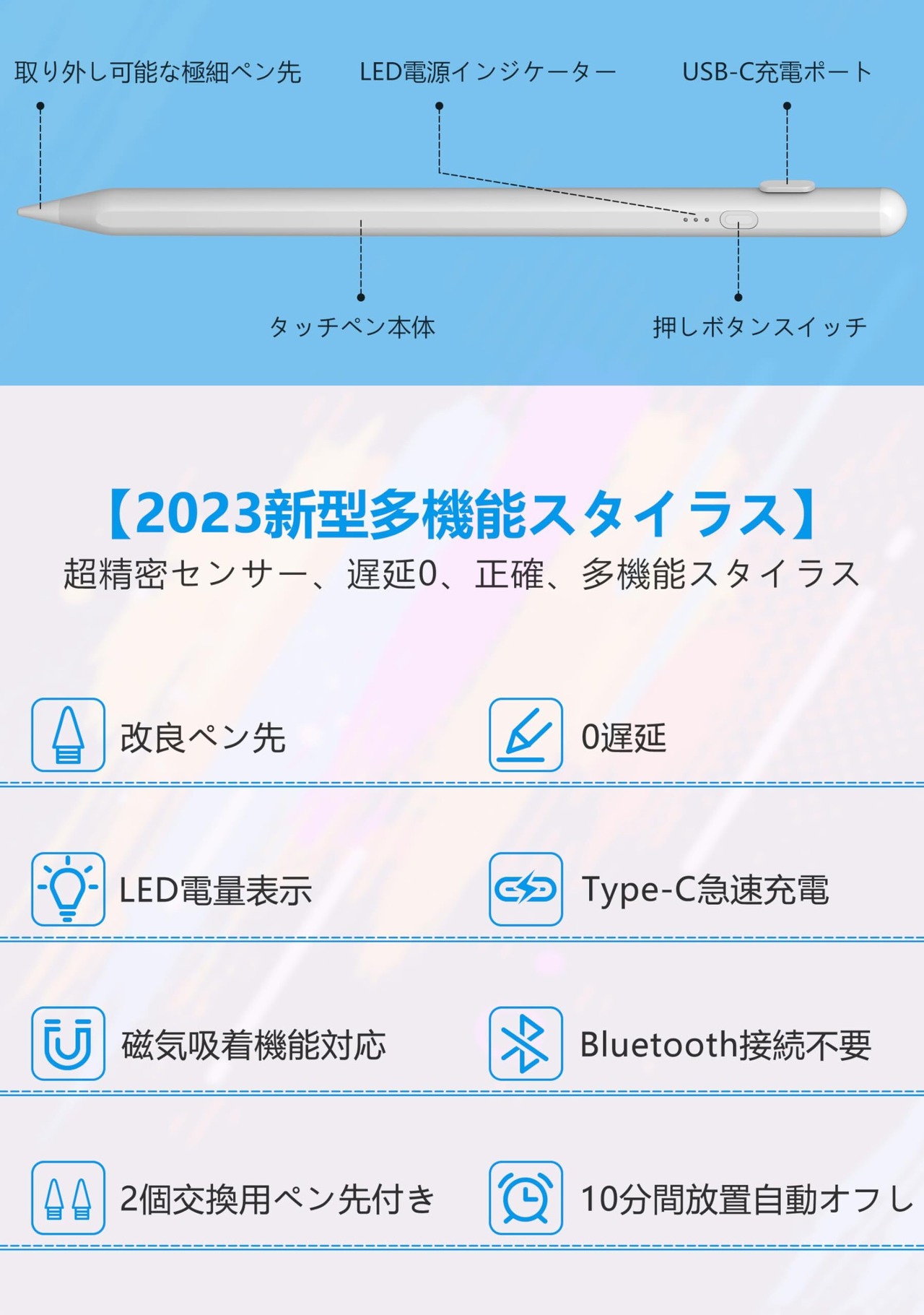 2024最新 iPad ペンシル 第10世代対応 傾き感知/磁気吸着機能対応/超高感度 タッチペン 誤作動防止機能対応 軽量 耐摩 USB type-c充電式 スタイラスペン 2018年以降iPad/iPad Pro/iPad air/iPad mini対応 iPad 2018-2024用ペンシル