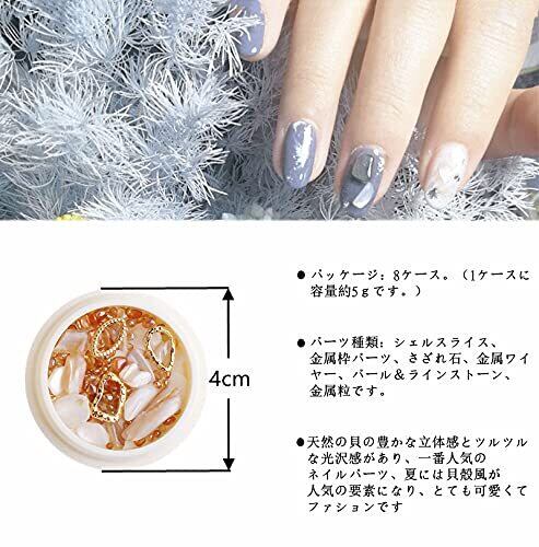 【8種類】ネイルアートの貝殻風パーツは8種類の人気のあるデザインがあります、お客様の手芸に輝きと魅力を与えます。材質:パーツ/合金、ストーン、アクリル ケース/アクリルです。