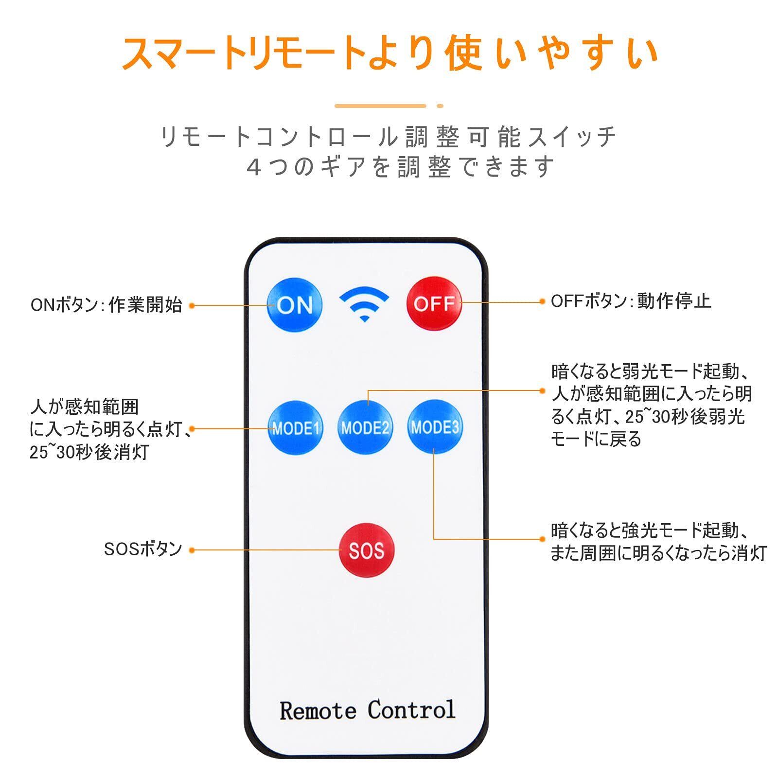 【3つ智能モード&リモコン付】:モード1:人が感知範囲に入ったら明るく点灯、25~30秒後消灯。モード2:暗くなると弱光モード起動、人が感知範囲に入ったら明るく点灯、25~30秒後弱光モードに戻る。モード3:暗くなると30%の明るさで点灯、また周囲に明るくなったら消灯。リモコンは最大5m離れた場所で使用すると、さまざまなモードを調整できます。(注:リモコンを使用する前に、絶縁シートを取り出してください。)