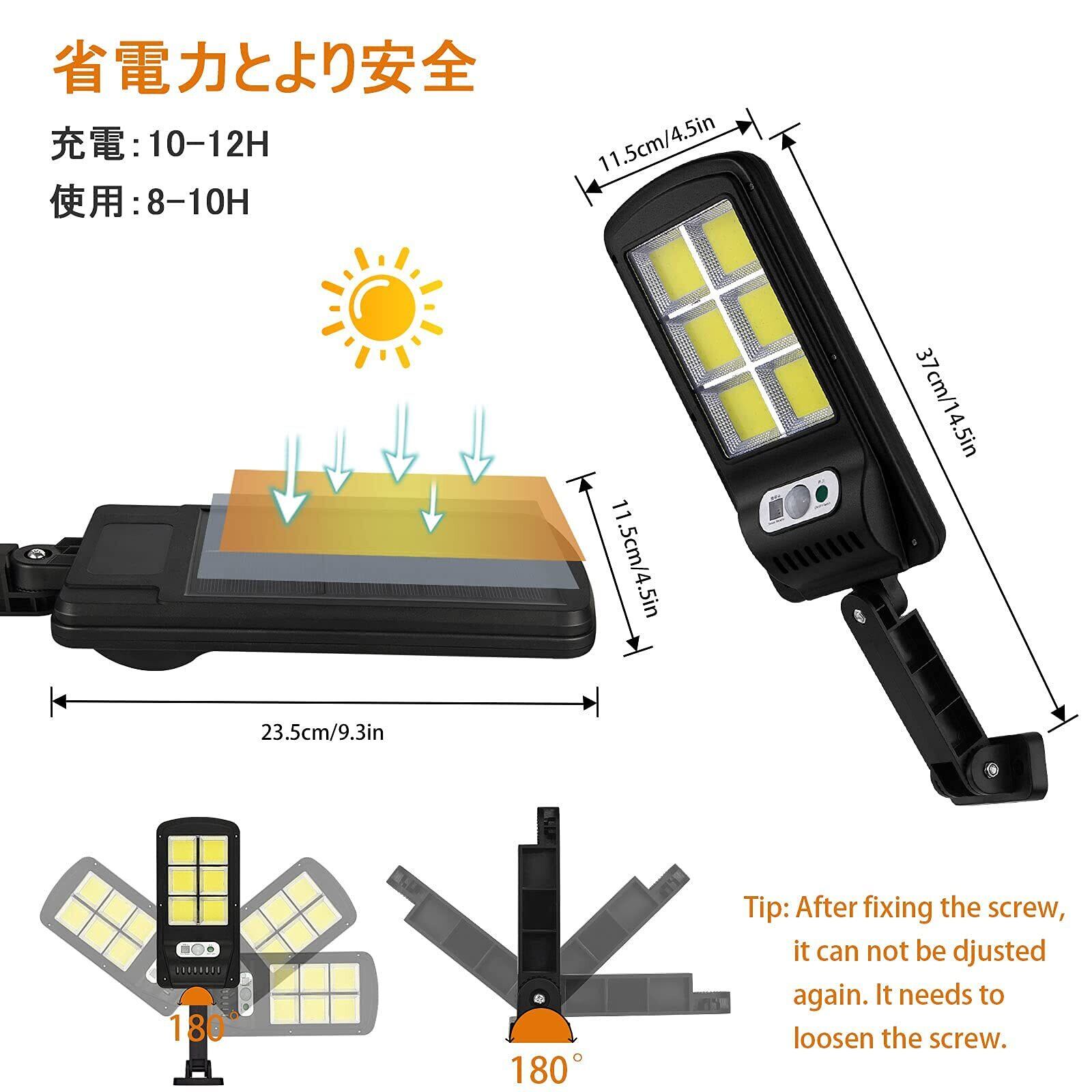 【120COB LED・センサー角度180°】:パッケージにはソーラーセンサーライト×1個、取扱説明書×1枚、ネジ2本を含めています。 通常のCOB LEDセンサーライトと比較して、このソーラーライトは120個COB LEDがあるから、より強い明るさを持っています。LED街灯のセンサー検知角度は180°、 照明範囲は180°で、センサー距離は5m~10mです。人や動物がこの検知範囲に入る限り、センサーライトは自動的に点灯します。