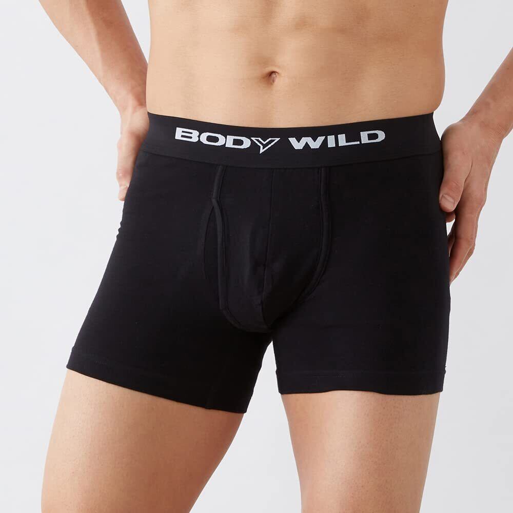 太目のブラックバンドと「BODY WILD」のビッグロゴ! ! 便利な前あきの機能はそのままに、開く部分をスッキリとした形状にした、綿混素材のボクサーブリーフ。
