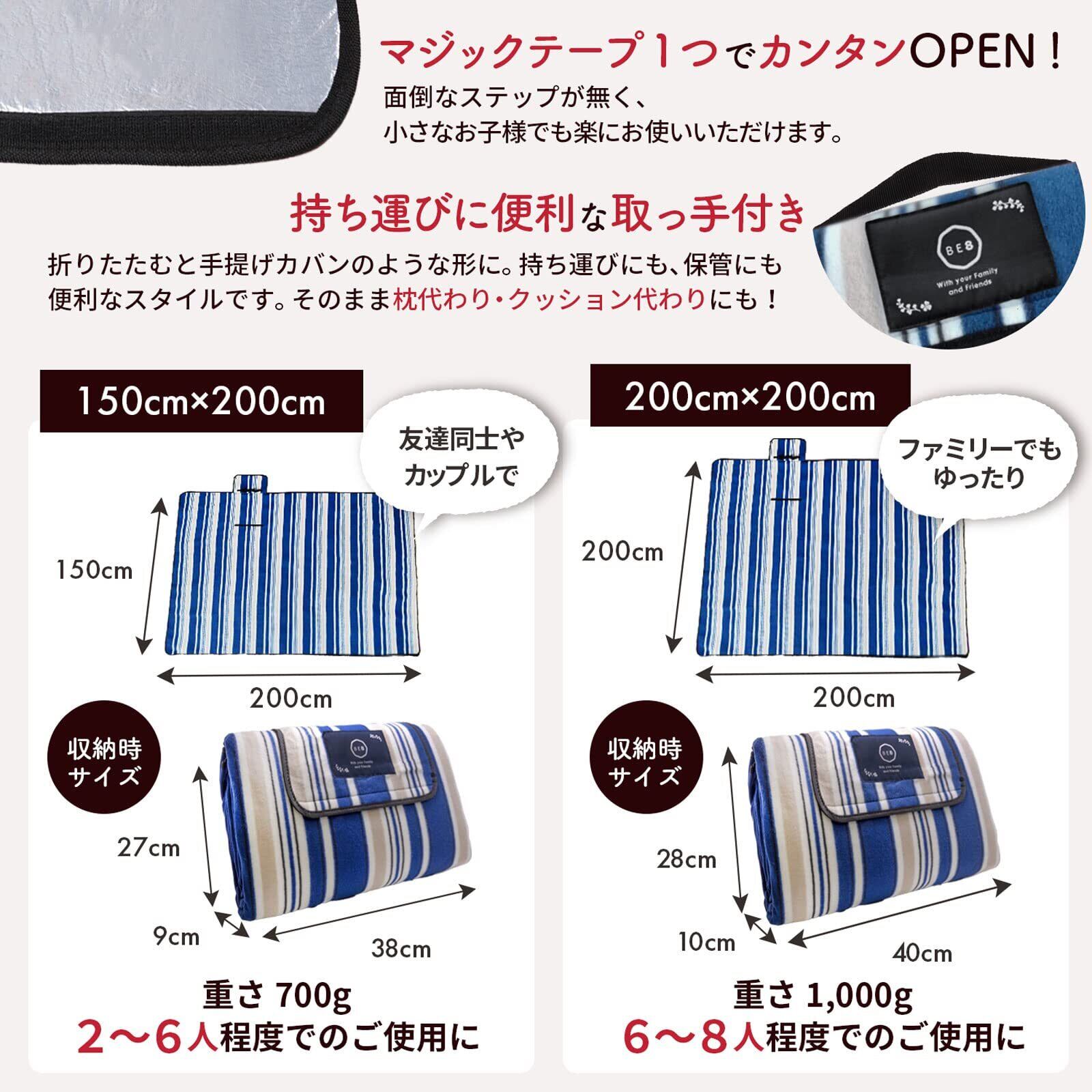 BE8(ビーエイト) レジャーシート 2~8人用 200×150cm 200×200cm防水 断熱 大判 厚手 キャンプ ピクニック 運動会 ビーチ BBQ 収納 便利 (200×200, ネイビー)