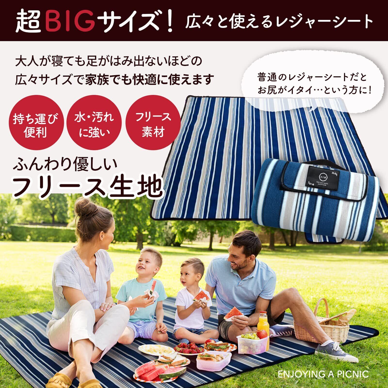 【広々使えるBIGサイズ】150×200cm(2~6人向け)と、ゆったりご使用いただける200×200cm(6~8人向け)の2サイズをご用意いたしました。BIGサイズですので、大人数でのご使用はもちろん、横になることもできる大きさなので少人数で広々とご使用いただくことも可能です。お弁当を広げても窮屈にならず快適にレジャーをお楽しみいただけます。