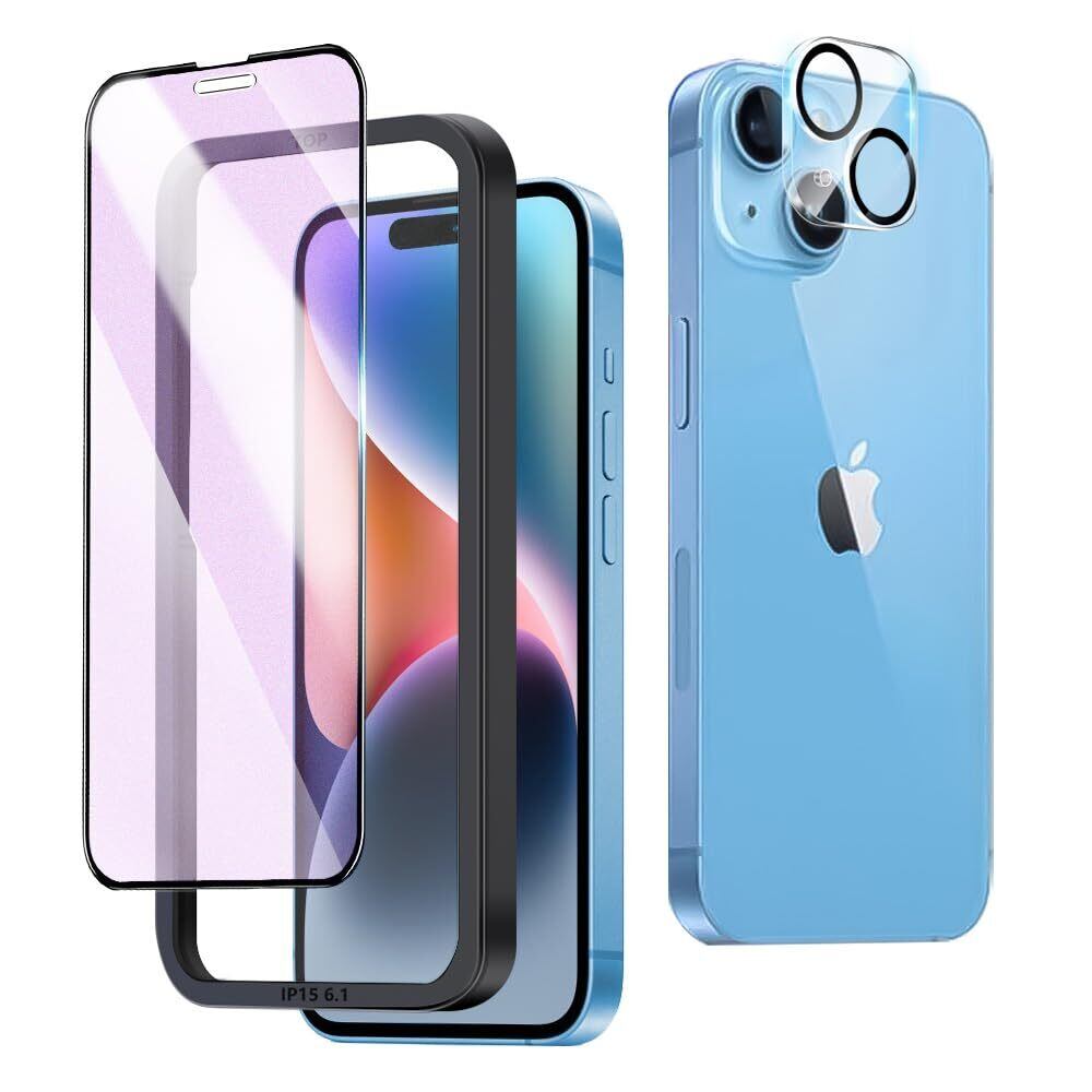 対応 iPhone 15 用 フィルム/iPhone 14 用 フィルム,ブルーライトカット 旭硝子 非光沢 ガイド枠付き iPhone 15 用 ガラスフィルム【1枚+1枚】レンズ保護フィルム付 フルカバー さらさらフィルム iPhone 15 用/iPhone 14 用 強化ガラス 液晶保護フィルム 反射防止 目の疲れ軽減 防指紋 気泡レス 3D曲面 全面吸着 フルカバー 6.1インチ