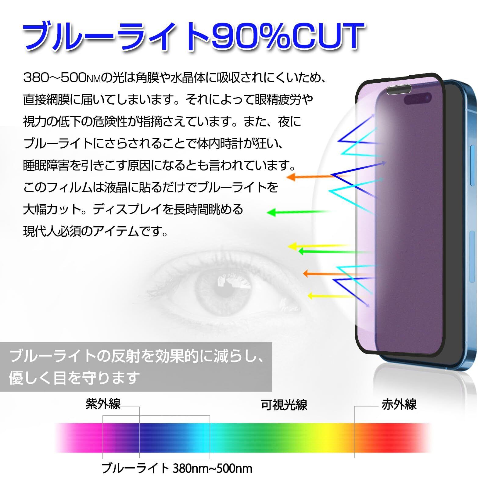 【ブルーライトカット 】ブルーライトカット反射技術により、LEDディスプレイから発せられる青色光を大幅にカットでき、目の疲れを軽減させ、画面を長時間眺める方に効果を発揮します。iPhone 15 ブルーライトフィルムは国内の眼鏡レンズ検査機関でブルーライトカット率の試験を実施、ブルーライトカット率 90%で。ブルーライトカットタイプはその特性としてクリアタイプと比較して屋外では紫色の反射、画面のカラーは黄味がかった色となります。スマホを長時間利用することが多く、目の疲労感が気になるという人におすすめです。