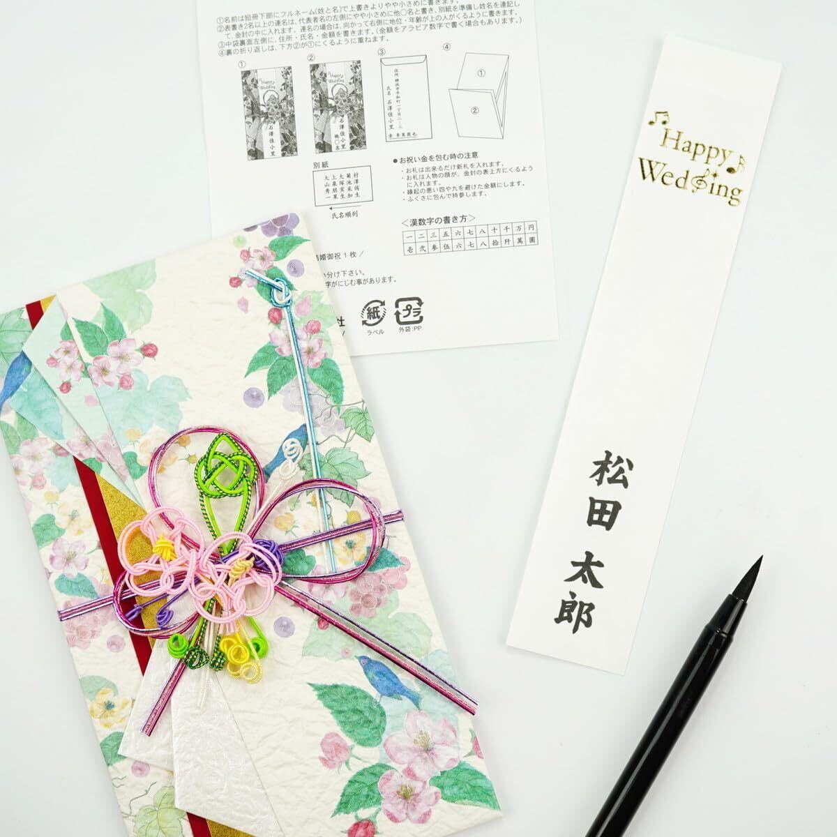 【その他】幸せの青い鳥や海外では愛の実を結ぶと伝えられるぶどうの入ったデザイン金封。3万~5万目安の新札で10万円まで入ります。