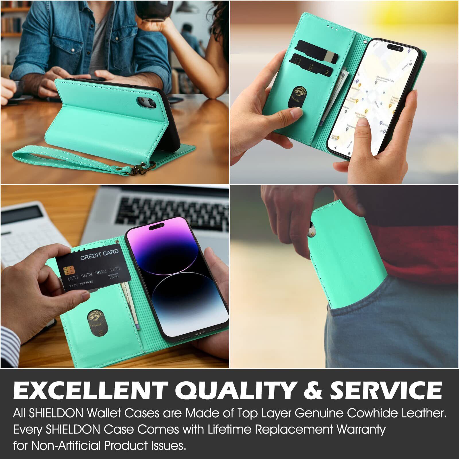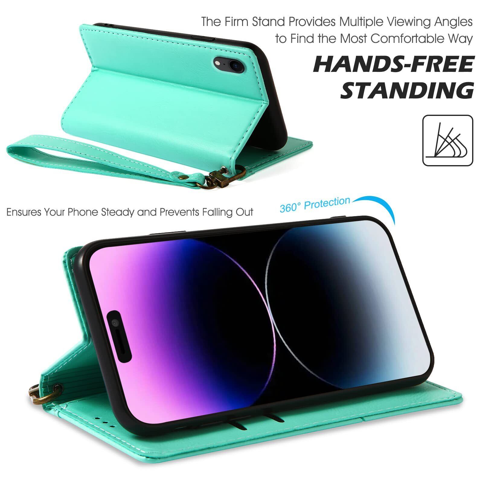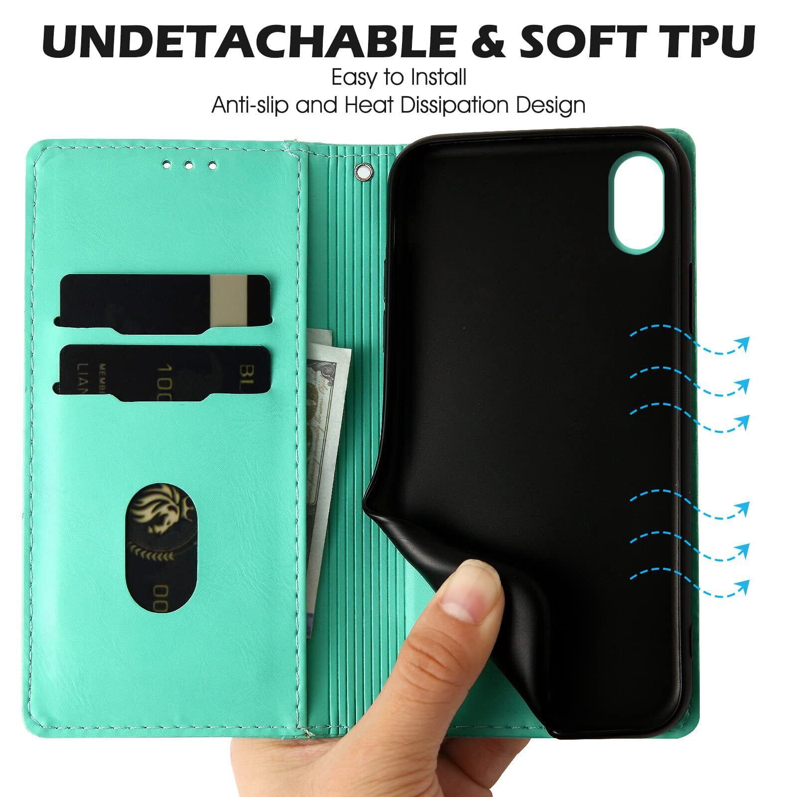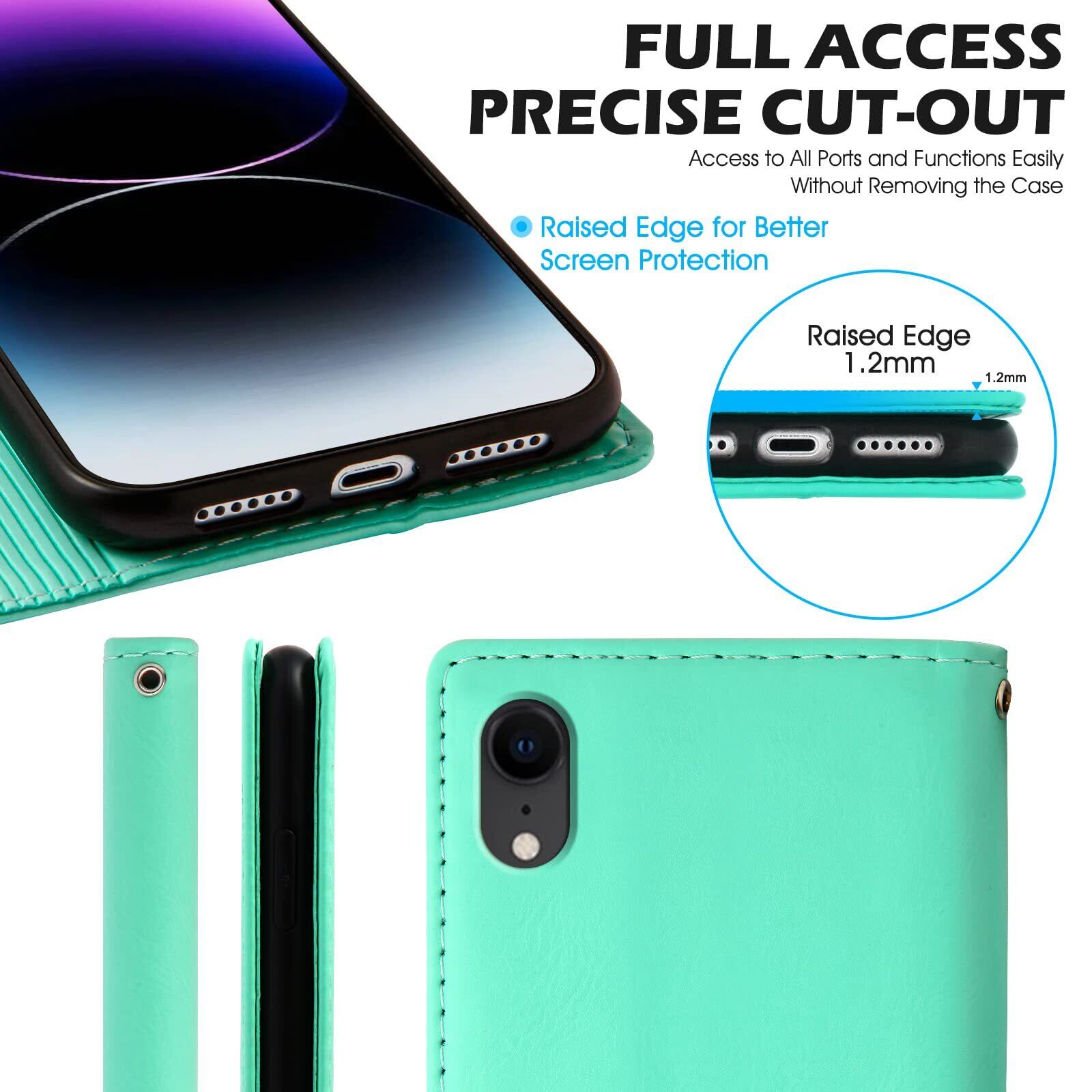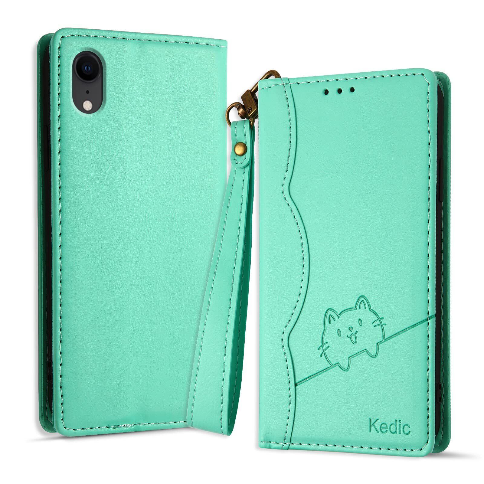 Kedic iPhone XR ケース 手帳型 アイフォンXR ケース 可愛い笑顔の猫模様 手作り iPhoneXR 携帯カバー iPhonexrスマホケース手帳型 おしゃれ カード入れ 財布型 と横方向のスタンドが 多機能 アイフォン XR カバー 内蔵マグネット式 純色シンプルデザイン iPhone XR 手帳型ケース 緑
