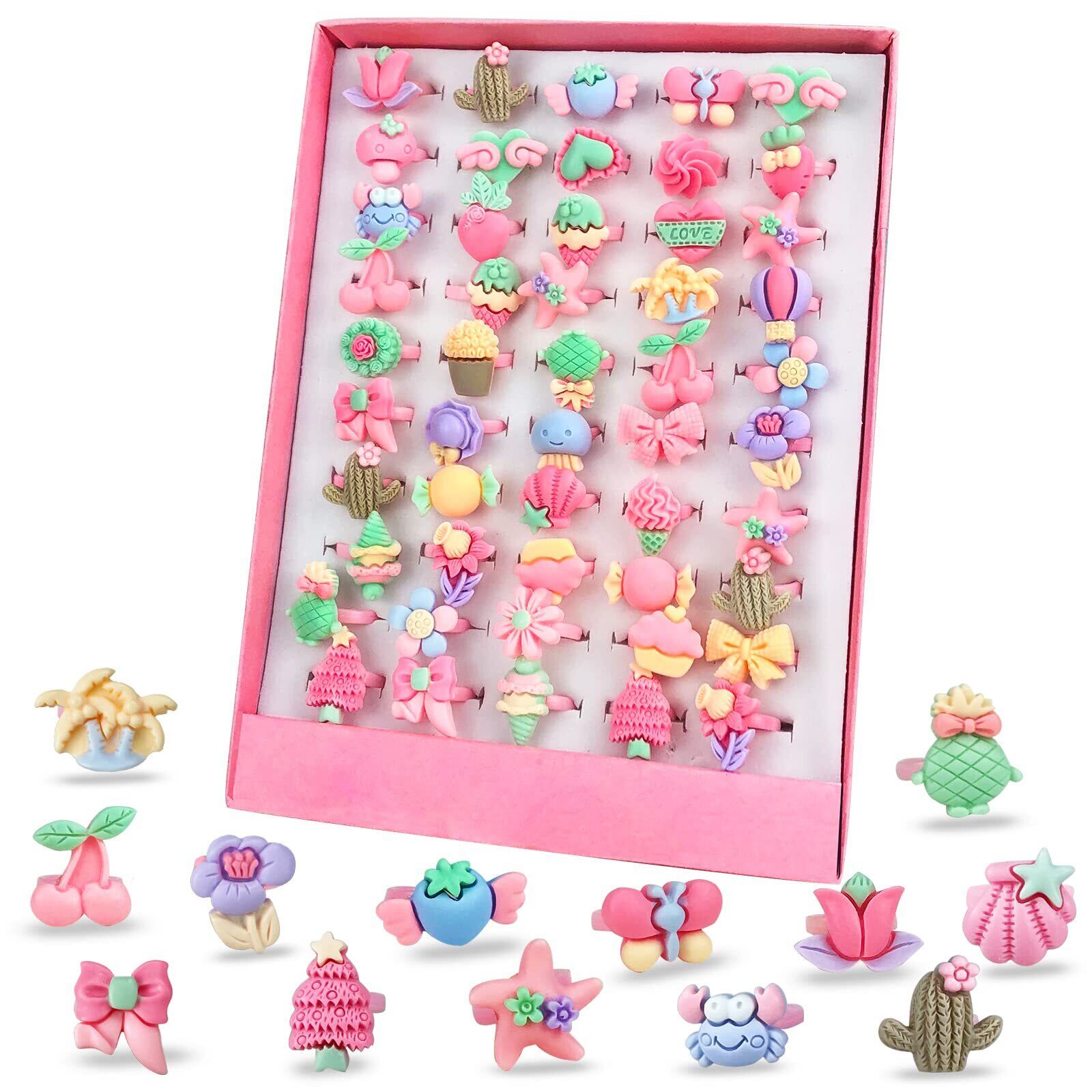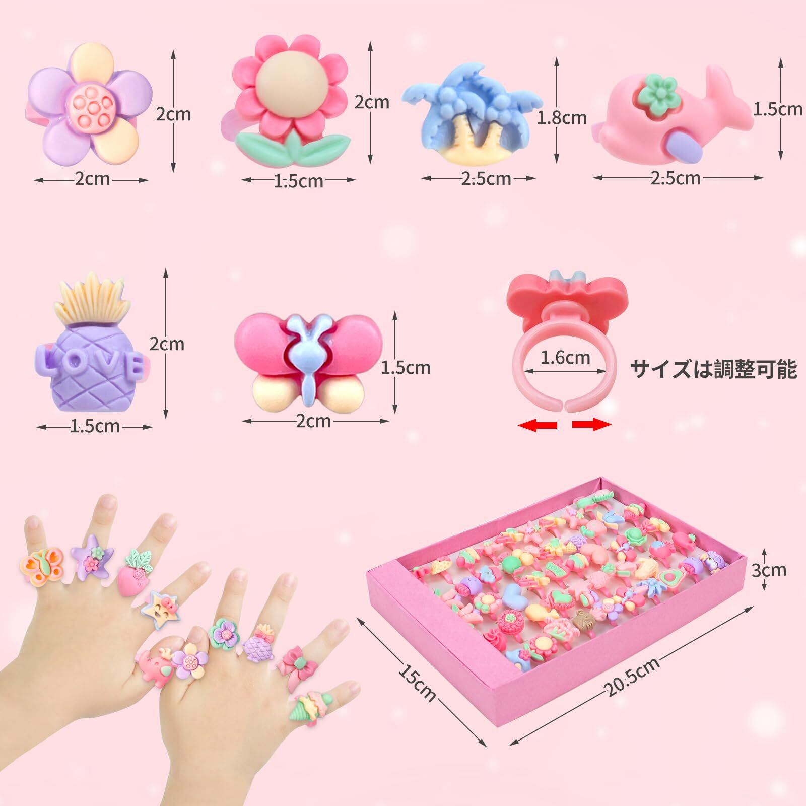 【可愛い指輪セット】子供用指輪 おもちゃ50点セットを集まっています。ユニークなデザインで、例えば、人気なひまわりとか、かわいいカニとか、蝶とか、アイスクリームとか、リボンとか、花のハートとかします。いろいろなデザインがあって、超可愛いで、図面のように表示されます。6歳以上の子供に適用しています。